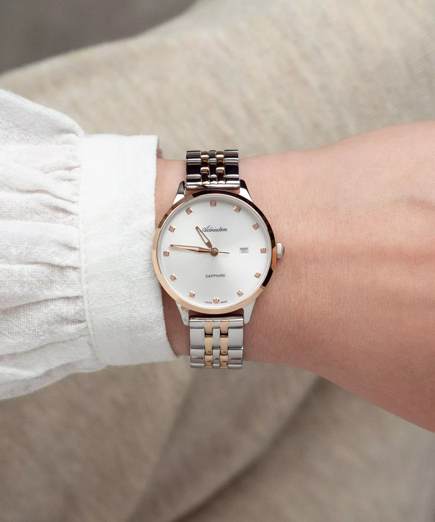 Adriatica Classic A3831.R143Q — шикарные женские часы, которые отличаются двухцветным корпусом в оттенках розового золота и серебра. Сапфировое стекло и стальной браслет нежных оттенков делают эту модель идеальными часами для элегантной женщины. Кварцевый механизм Ronda 785 обеспечивает ее работоспособность, а водонепроницаемость 30 метров дарит комфорт в повседневном использовании.