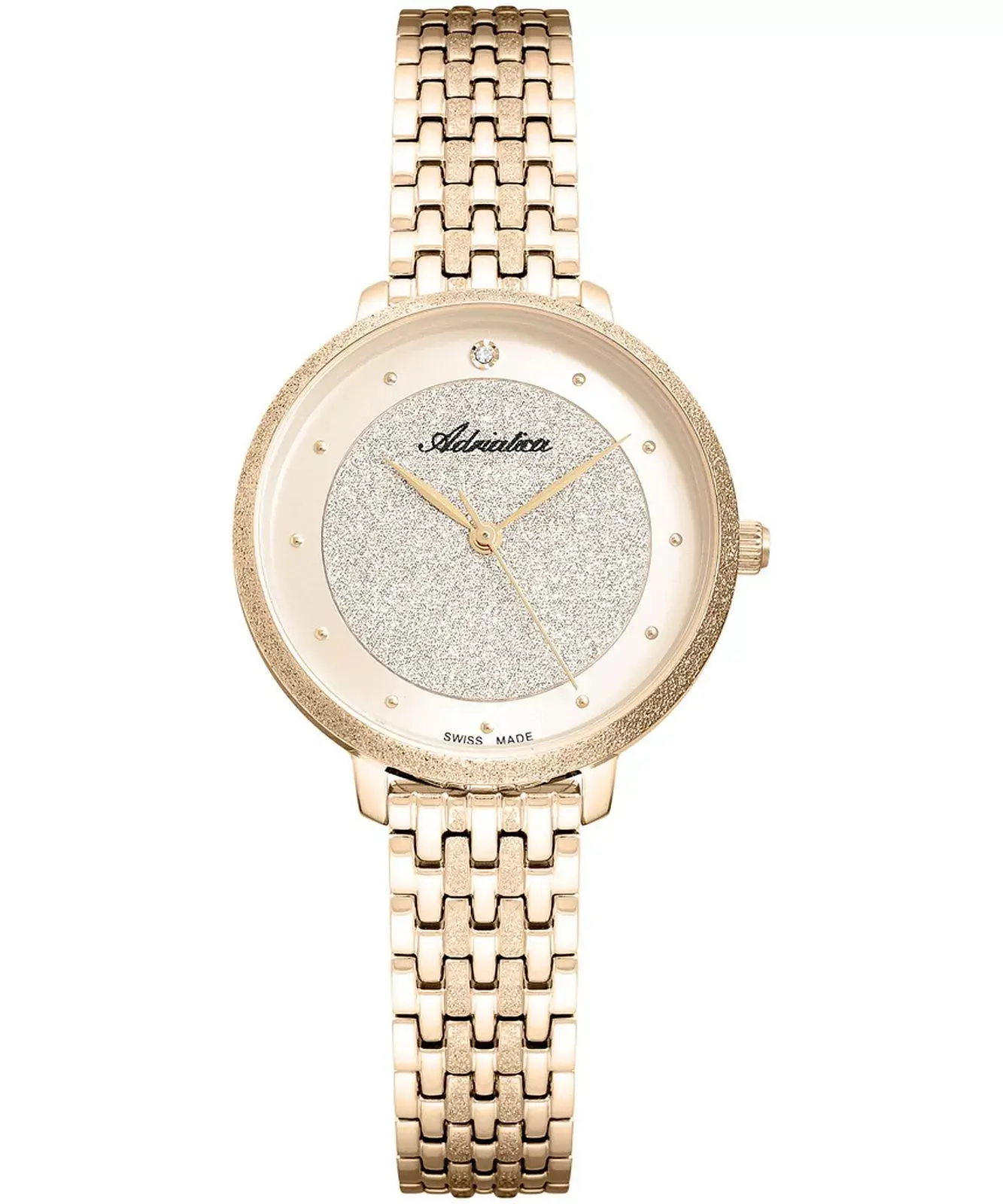 Модель Adriatica Fashion A3751.1141Q понравится женщинам, которые любят модные аксессуары с оригинальным декором. Циферблат часов украшен блестками и кристаллом, служащим указателем двенадцати часов. Минеральное стекло защищает его от повреждений. И корпус, и браслет изготовлены из коррозионностойкой нержавеющей стали. Всё золотое. Изделие водонепроницаемо на глубине до 30 метров, что защищает кварцевый механизм Ronda 763 Swiss Made от попадания небольшого количества воды.