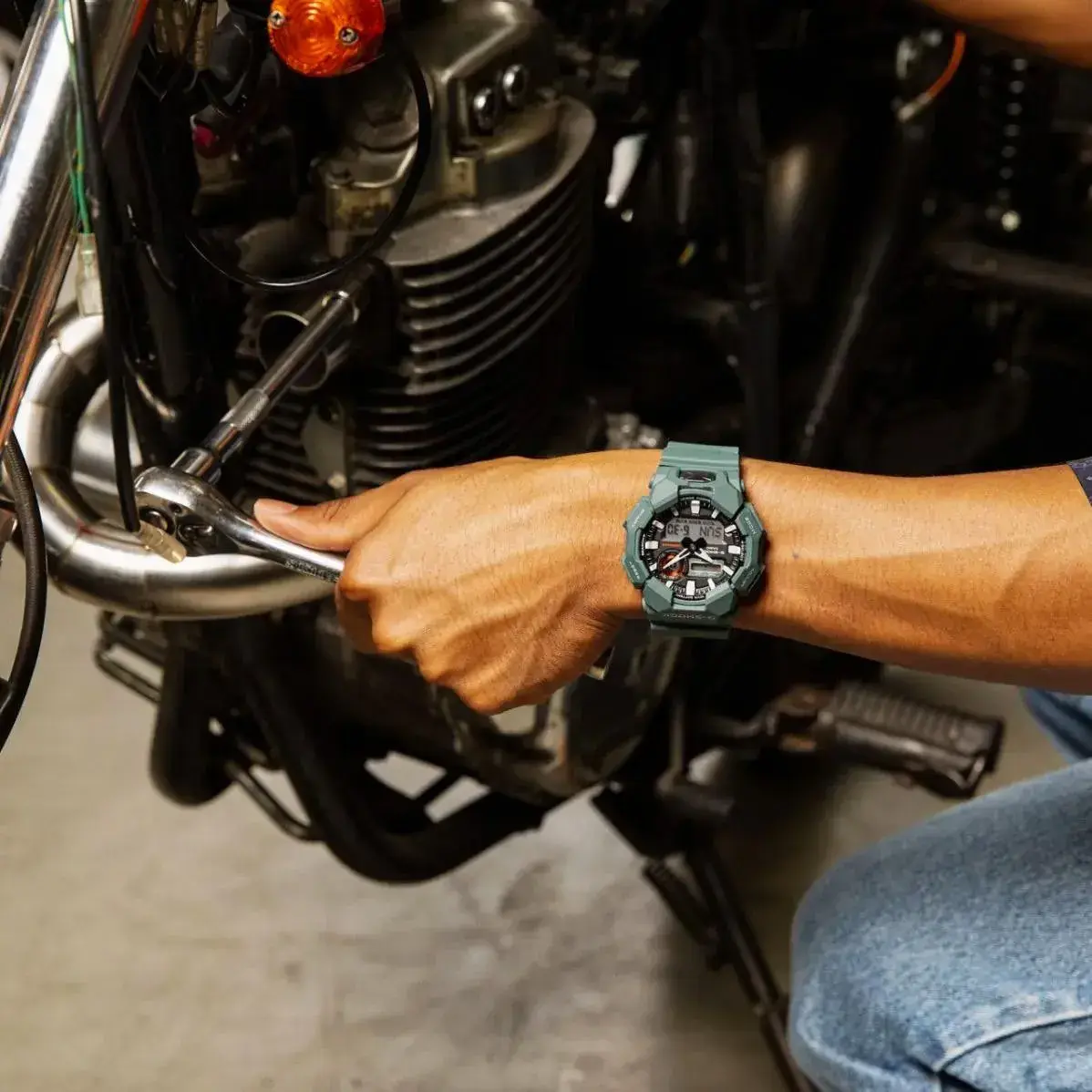Противоударные кварцевые наручные часы Casio GA-010-2A коллекции G-Shock с цифровой+стрелочной индикацией времени. Калибр механизма — 5735. Корпус усилен углеродным волокном, изготовленным по технологии Carbon Core Guard. Функциональность данной модели: формат времени 12/24, автоматический календарь до 2099 года, функция летнего времени (DST), мировое время в 48 городах (31 часовой пояс), 5 независимых будильников, сигнал начала часа, секундомер с точностью 1/100 секунды и измерением до 24 часов, таймер обратного отсчета в диапазоне 60 минут, диодная подсветка циферблата (Super Illuminator) с возможностью выбора продолжительности подсветки (1,5 или 3 секунды) + необритовое (Neobrite) покрытие на стрелках для длительного послесвечения в темноте, функция выключения звука нажатия кнопок (Mute), функция смещения стрелок для удобного просмотра информации на цифровом экране. Водонепроницаемость WR200 (20 атм). Батарейка на 10 лет работы. Размеры корпуса: (ШxВxТ) 51.9x55.1x17.5 мм.