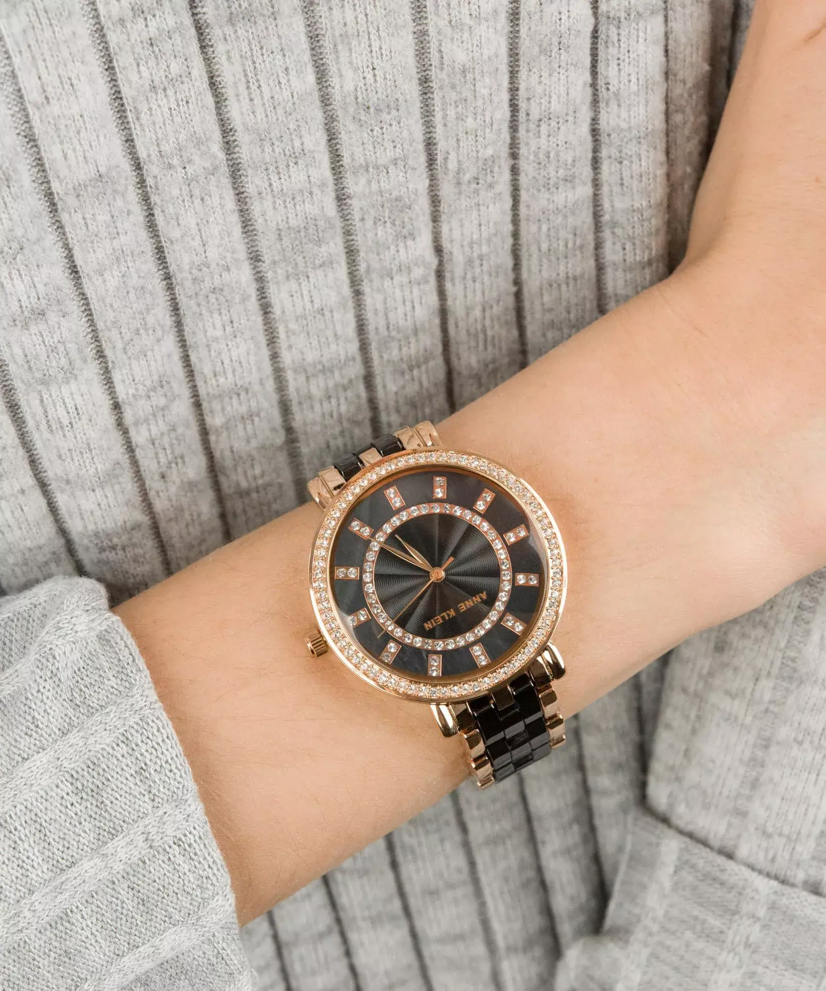 Anne Klein Swarovski Crystal Accented AK/3810BKRG – элегантные и в то же время ювелирные женские часы. Стиль из черного и розового золота, украшенный кристаллами Сваровски, привлекает внимание. Преимуществом модели является браслет из антиаллергенного керамического синтера. Изделие устойчиво к незначительным брызгам.