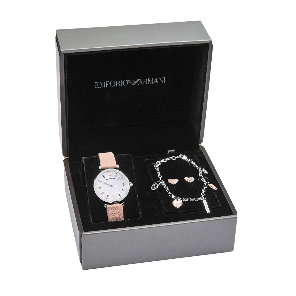 Комплект из часов, сережек в виде сердца и браслета из нержавеющей стали с логотипом. Корпус часов выполнен из нержавеющей стали. Циферблат на месте меток украшен кристаллами. Розовый кожаный ремешок.