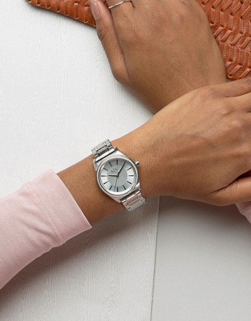 Кварцевые часы. Водостойкость WR 50. Часы, минуты, секунды. Корпус выполнен из нержавеющей стали. Диаметр корпуса 36 мм, толщина 9 мм. Минеральное стекло. Корпус украшен кристаллами. Браслет из нержавеющей стали.