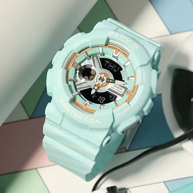 Очередная горячая fashion-новинка Baby-G в бирюзовом корпусе с линейным принтом на ремешке Baby-G Pink Color. Противоударный корпус защищает механизм от ударов и вибрации. Циферблат подсвечивается светодиодом. Мировое время – 48 городов (29 часовых поясов), всемирное координированное время (UTC). Функция включения/отключения летнего времени. 12-ти и 24-х часовой формат времени. Секундомер с точностью показаний 1/100с и временем измерения 24ч. Сплит-хронограф. Таймер обратного отсчета от 1мин до 24ч. Функция включения/отключения звука.