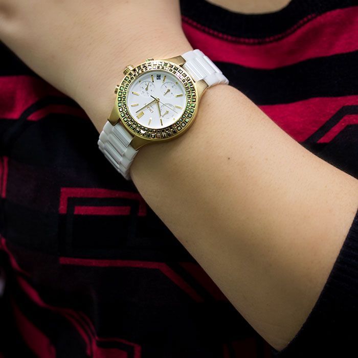 Корпус из нержавеющей стали золотистого цвета с белым керамическим браслетом. Безель с кристаллами. Белый циферблат с золотыми метками. Отображение даты между позициями 4 и 5 часов. Три хронографа: 24 часа, 24 часа и день недели. Кварцевый механизм. Устойчивое к царапинам минеральное стекло. Диаметр корпуса: 38 мм. Толщина корпуса: 12 мм. Ширина браслета: 20 мм. Застежка разворачивается. Водонепроницаемость 50 метров / 165 футов. Функции: дата, день, 24 часа, час, минута, секунда. Повседневный стиль часов. DKNY Chambers White Ceramic Ladies Watch NY2224.