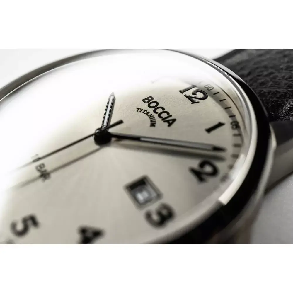 Мужские кварцевые часы. Центральные часовая, минутная и секундная стрелки. Апертура даты в позиции 3 часов. Серебристый циферблат. Арабская индикация времени. Круглый корпус выполнен из гипоаллергенного титана. Диаметр корпуса составляет 40 мм, толщина 9 мм. Заводная головка с защитой. Черный кожаный ремешок, классическая застежка. Устойчивое к возникновению царапин сапфировое стекло. Водостойкость WR 100 (плавание без погружения).