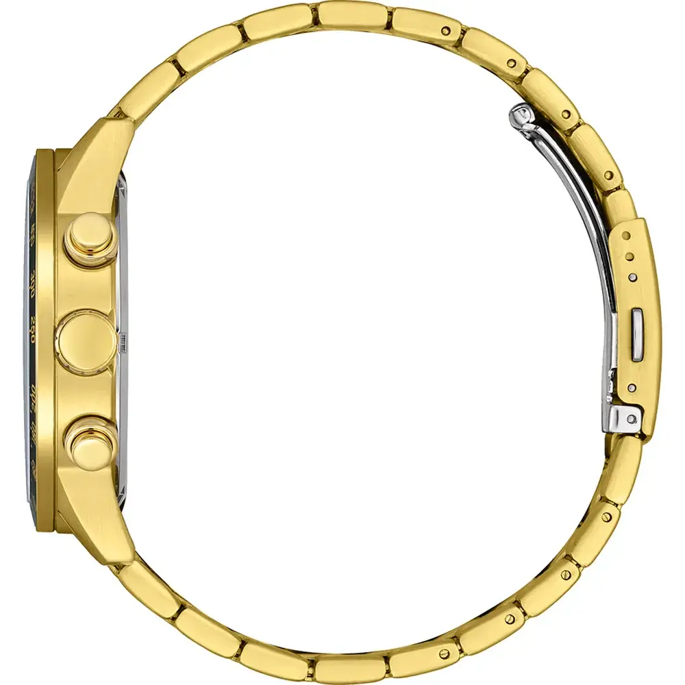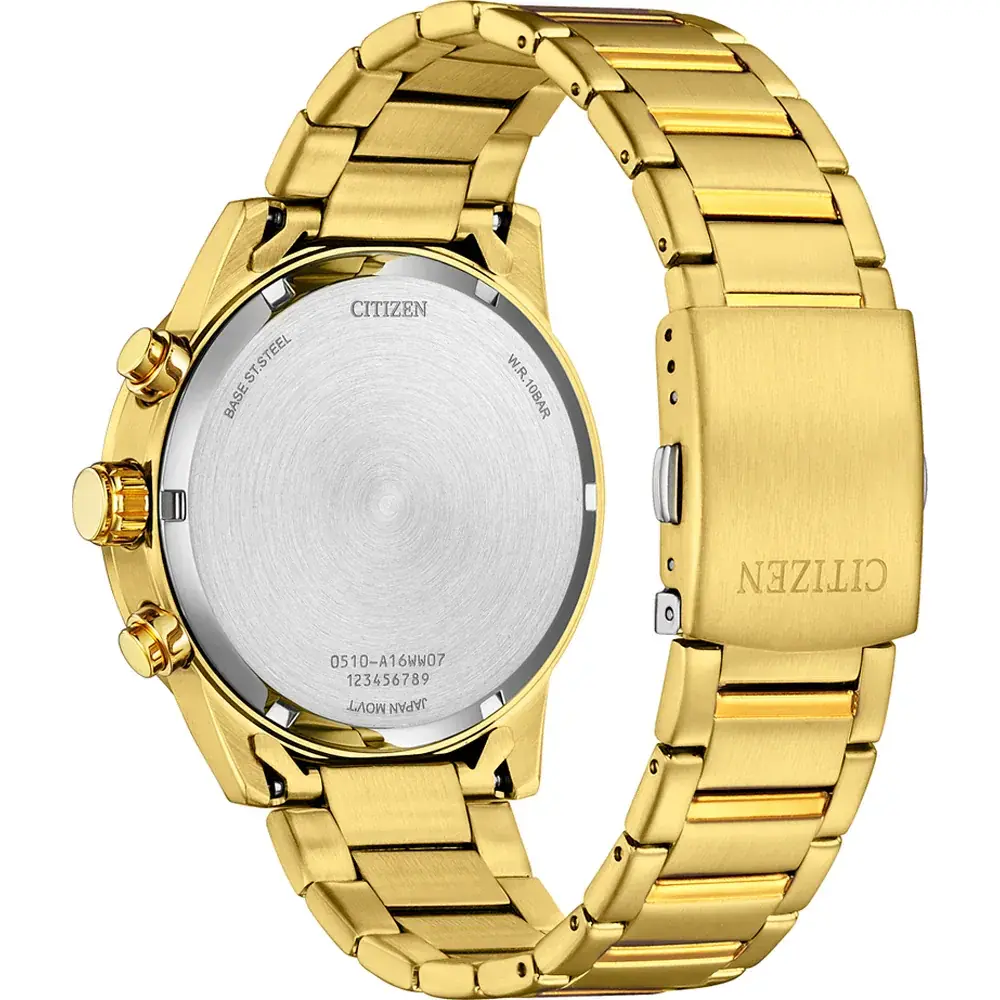 Мужской кварцевый хронограф. Калибр механизма Citizen 0510. Центральные часовая и минутная стрелки, секундная стрелка вынесена на малый циферблат. Круглый корпус выполнен из нержавеющей стали с частичным PVD покрытием Диаметр корпуса составляет 44 мм, толщина 11 мм. Стальной браслет шириной 20 мм с частичным покрытием, раскладывающаяся застежка. Прочное минеральное стекло устойчивое к мелким механическим повреждениям.