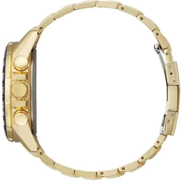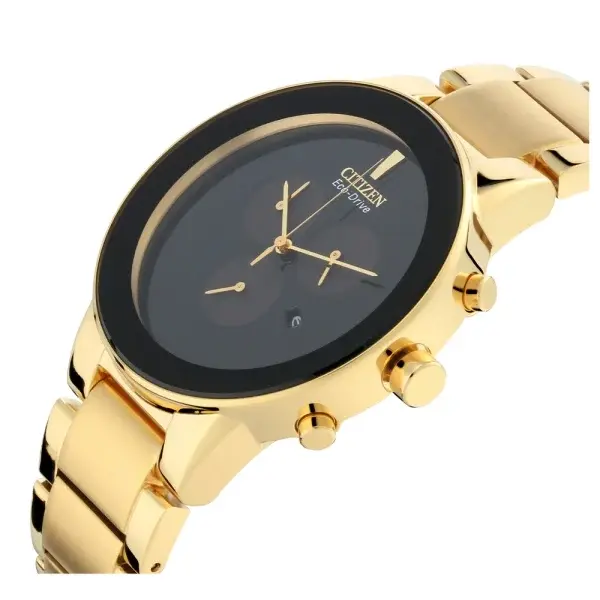 Мужской кварцевый хронограф на солнечной батарее. Запас хода 5 месяцев. Калибр механизма H504. Центральные часовая и минутная стрелки, секундная стрелка вынесена на малый циферблат. Апертура даты в позиции 4 часов. 12/24х часовой формат времени. Секундомер. Черный циферблат. Корпус выполнен из нержавеющей стали с IP покрытием цвета желтого золота. Диаметр корпуса составляет 43 мм. Стальной браслет с покрытием, раскладывающаяся застежка. Прочное минеральное стекло устойчивое к мелким механическим повреждениям. Водостойкость WR 30 (брызги). Вес примерно 156 г.