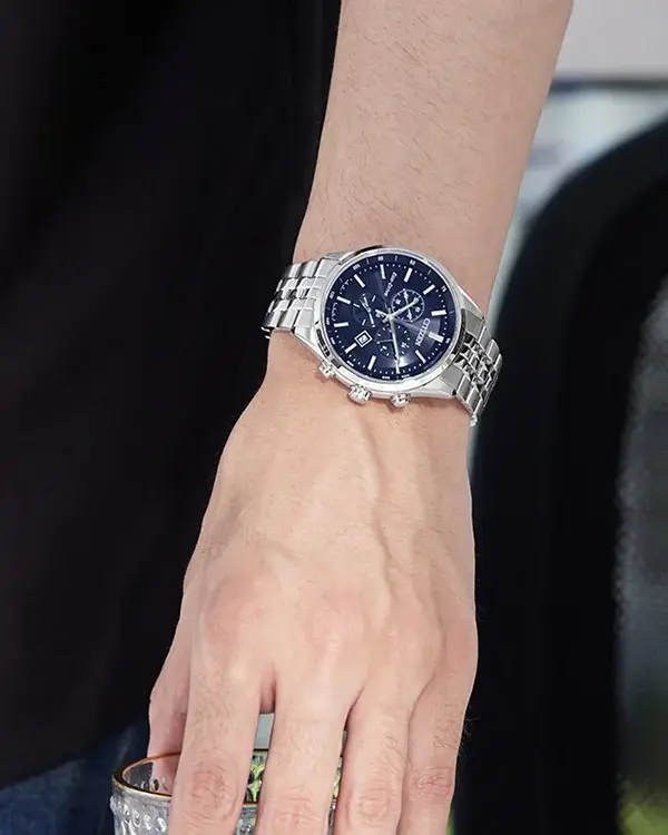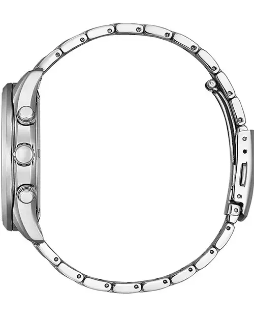 Кварцевый хронограф. Система Eco-Drive не требующая замены батарейки. Питание от солнечной энергии. Защита от перезаряда. Индикатор низкого заряда батареи. Водостойкость WR 100 (плавание без погружения). Часы, минуты, секунды. Индикация даты. Хронограф. Тахиметр. Стрелки и метки с люминесцентным покрытием. Циферблат с часовыми индексами в виде штрихов. Корпус выполнен из нержавеющей стали. Диаметр корпуса 42 мм, толщина 11 мм. Устойчивое к возникновению мелких механических повреждений сапфировое стекло. Браслет выполнен из нержавеющей стали. Раскладывающаяся застежка.
