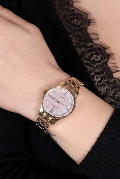 Женские кварцевые часы на солнечной батарее. Калибр механизма Citizen E031. Запас хода при полной зарядке 180 дней. Функция индикации заряда. Центральные часовая, минутная и секундная стрелки. Циферблат цвета шампань. Круглый корпус выполнен из нержавеющей стали с IP покрытием цвета желтого золота и декорирован бриллиантом. Диаметр корпуса составляет 31,5 мм. Стальной браслет с покрытием шириной 14 мм выполнен в технике миланского плетения, раскладная застежка. Устойчивое к возникновению царапин сапфировое стекло. Водостойкость WR 50 (мытье рук, дождь).