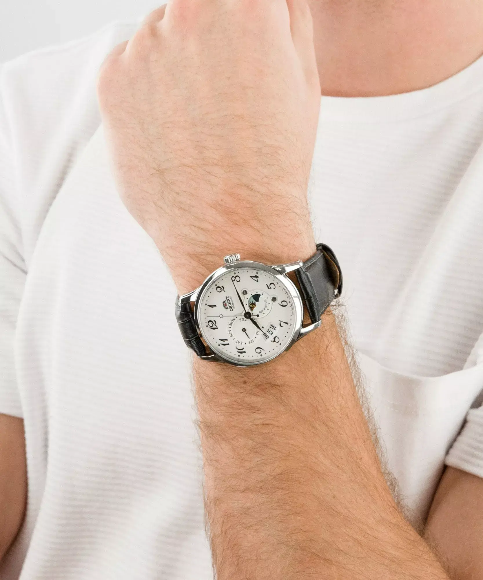 Orient Automatic Sun And Moon RA-AK0003S10B — мужская модель, которая идеально подойдет для официальных и деловых нарядов. Часы работают благодаря точному механизму с автоподзаводом, который приводится в действие движением запястья владельца. Прочный белый корпус часов выполнен из нержавеющей стали. Модель поставляется на черном ремешке из кожи. Ремешок очень прочный и удобный для ношения. Белый циферблат прекрасно защищен от царапин сапфировым стеклом. Водонепроницаемость 5 АТМ защищает часы от повреждений, вызванных брызгами во время принятия душа или мойки автомобиля.