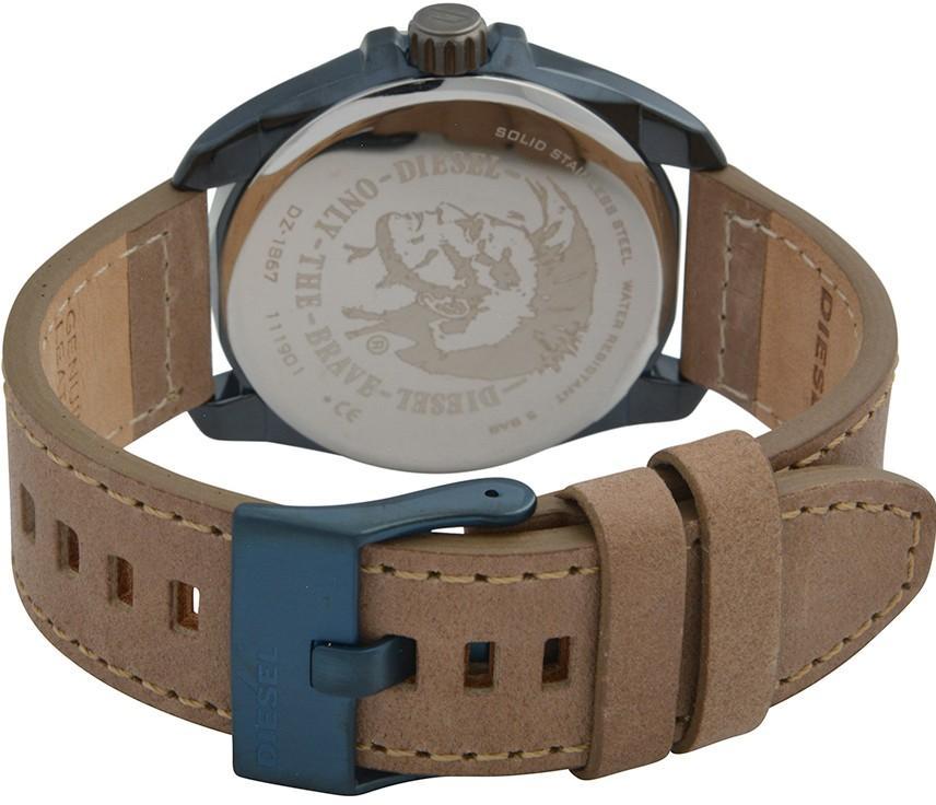 Эти 44-миллиметровые часы оснащены серым циферблатом с черными стрелками и коричневым кожаным ремешком.