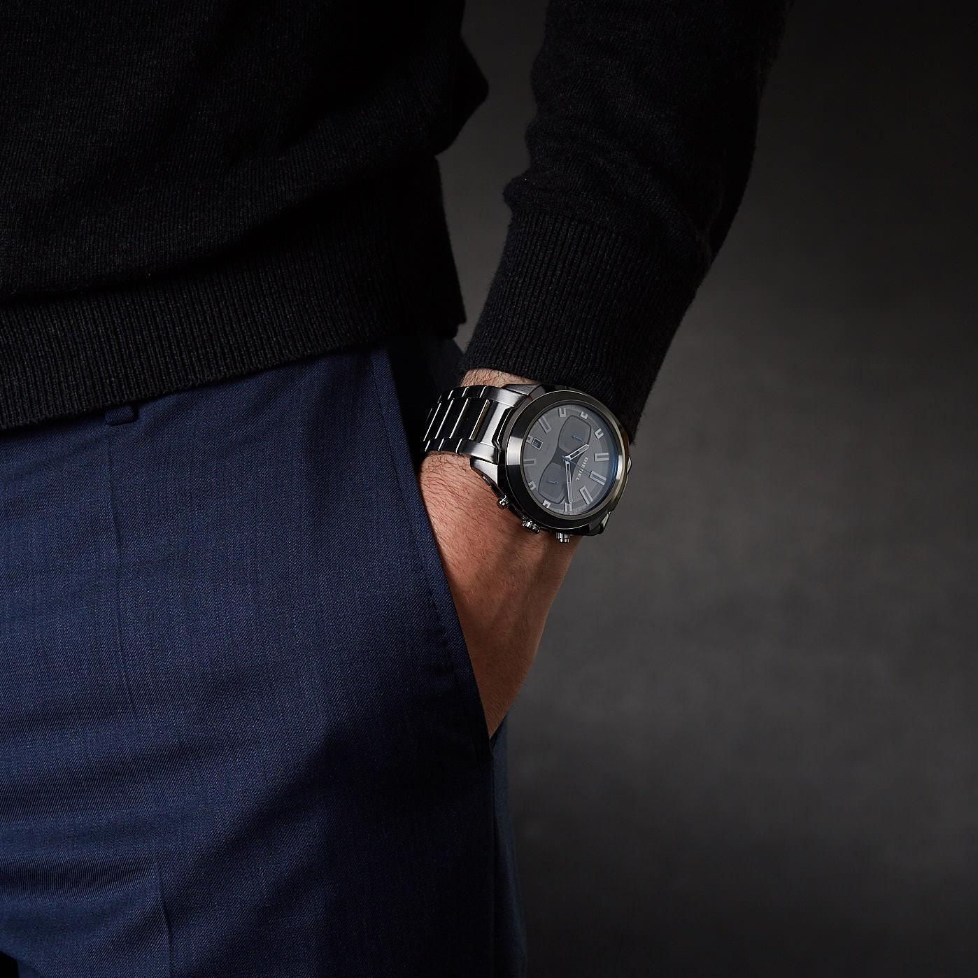 Мужской кварцевый хронограф. Центральные часовая, минутная и секундная стрелки. Апертура даты в позиции 6 часов. Счетчики хронографа расположены на отметке 3 и 9 часов. Темно-серый циферблат. Корпус выполнен из матовой нержавеющей стали с черным IP покрытием. Размер корпуса составляет 48х56 мм, толщина 14 мм. Стальной браслет с покрытием, раскладывающаяся застежка. Прочное минеральное стекло устойчивое к мелким механическим повреждениям. Водостойкость WR 50 (мытье рук, дождь).