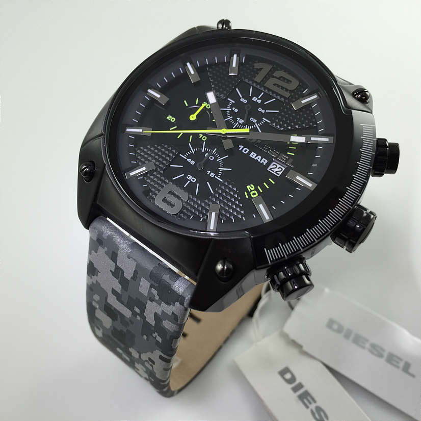 Кварцевый японский механизм с аналоговой индикацией. Точность хода не хуже -/+20 сек.в месяц. Центральная часовая и минутная стрелки, маленький секундный индикатор на «6 часах». Хронограф с центральной секундной стрелкой и 30-минутным индикатором. Суточник, отображающий время в 24-часовом формате, на «12 часах». Дата. Массивный корпус выполнен из нержавеющей стали 316L с ионным IP-покрытием черного цвета. Ширина корпуса 49 мм и толщина 13 мм. Минеральное стекло стойкое к возникновению царапин. Рельефный циферблат с накладными индексами и цифрами. Люминесцентный состав на стрелках и разметке циферблата. Задняя крышка имеет винтовое соединение с корпусом. Водостойкость до 100 метров (10 Атм). Комбинированный ремешок с элементами оформления в стиле цифрового камуфляжа и простой застежкой.