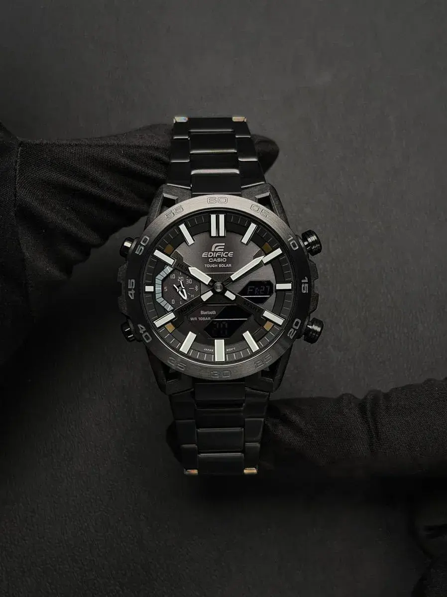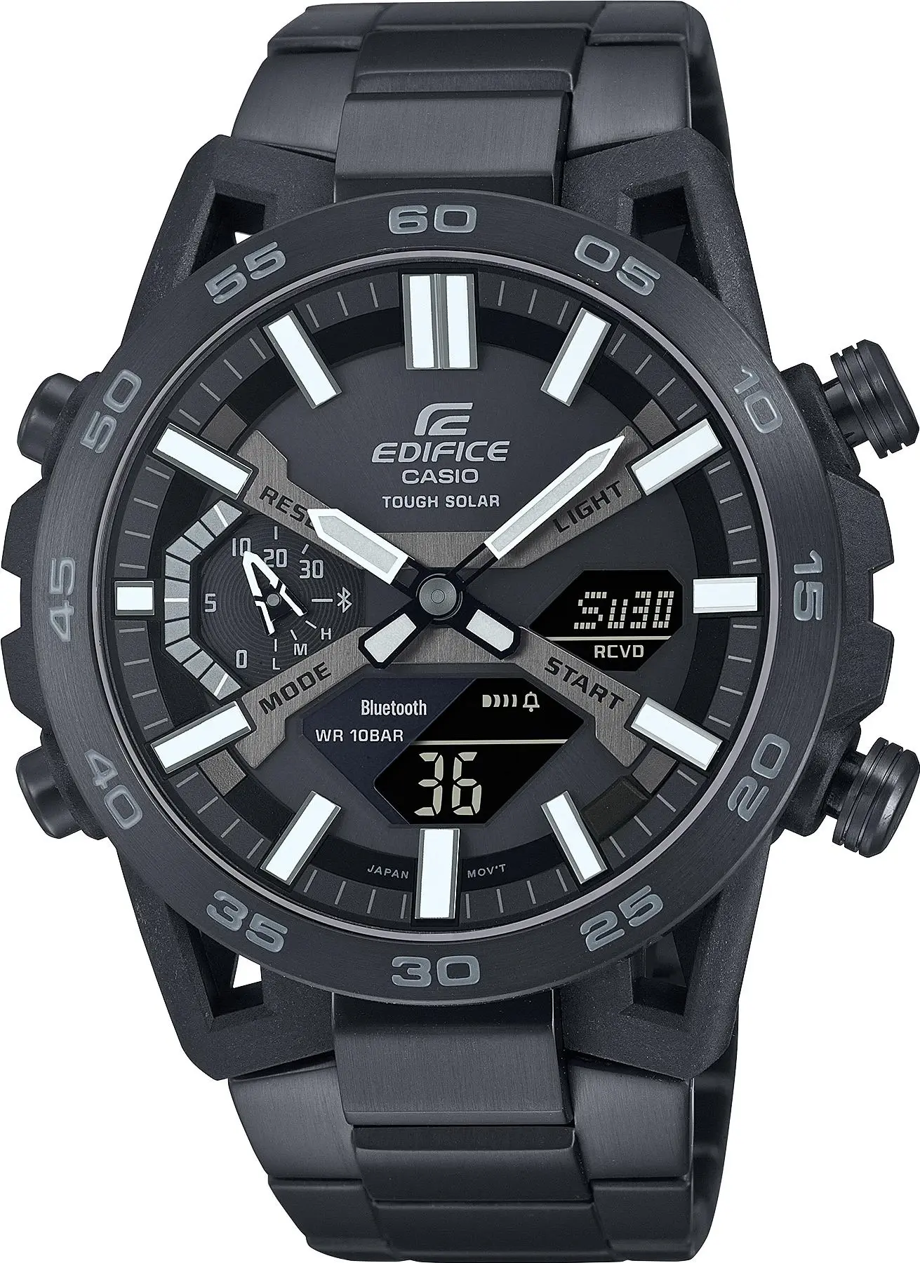 Многофункциональные часы, дизайн которых пропитан гонками и скоростью, без сомнения оценит любой мужчина. Edifice Sospensione. Мужские часы, дизайн которых вдохновлен подвеской болида Формулы-1. Ушки часов разработаны по схеме четырехрычажной подвески гоночного автомобиля. Питание от солнечной энергии Tough Solar - солнечные батарейки большой мощности, индикатор заряда батареи. Функция автоматического сохранения энергии. Время работы аккумулятора без подзарядки приблизительно 7 месяцев, при включенной функции сохранения энергии приблизительно 18 месяцев. Двойная подcветка: циферблат и ЖК-дисплеи подсвечиваются светодиодом, благодаря наличию функции задержки, после отпускания кнопки освещение горит еще несколько секунд. Настраиваемое послесвечение 1,5 или 3сек. Цвет подсветки: белый. Необритовое светонакопительное покрытие обеспечивает длительное послесвечение в темноте даже после кратковременного нахождения на свету. 12-ти и 24-х часовой формат времени. Секундомер с двумя точностями показаний: 1/100с (до 1ч) и 1с (после 1ч) и временем измерения 24ч. SPLIT-хронограф. Таймер обратного отсчета от 1с до 24ч. Мировое время – 38 городов (38 часовых поясов), всемирное координированное время (UTC). Автоматический переход на зимнее и летнее время, возможность включения/отключения данной функции. Отображение кода и названия города. Переключение между домашним и мировым временем. Беспроводная технология Bluetooth® со сверхнизким потреблением энергии для синхронизации со смартфоном. При подключении к смартфону часы корректируют текущее время, настраивают будильник, а также копируют настройки мирового времени (300 городов). Отображение дней недели на шести языках. Функции перемещения стрелок, поиска телефона и включения/отключения звука. Водонепроницаемость 10 Бар в соответствии с ISO 2281. Браслет с раскладывающейся тройной застежкой, расстегиваемой одним касанием.