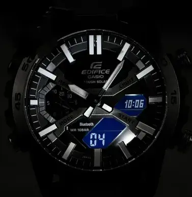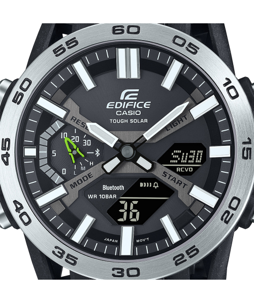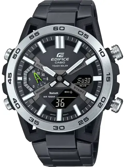 Многофункциональные часы, дизайн которых пропитан гонками и скоростью, без сомнения оценит любой мужчина. Edifice Sospensione. Мужские часы, дизайн которых вдохновлен подвеской болида Формулы-1. Ушки часов разработаны по схеме четырехрычажной подвески гоночного автомобиля. Питание от солнечной энергии Tough Solar - солнечные батарейки большой мощности, индикатор заряда батареи. Функция автоматического сохранения энергии. Время работы аккумулятора без подзарядки приблизительно 7 месяцев, при включенной функции сохранения энергии приблизительно 18 месяцев. Двойная подcветка: циферблат и ЖК-дисплеи подсвечиваются светодиодом, благодаря наличию функции задержки, после отпускания кнопки освещение горит еще несколько секунд. Настраиваемое послесвечение 1,5 или 3сек. Цвет подсветки: белый. Необритовое светонакопительное покрытие обеспечивает длительное послесвечение в темноте даже после кратковременного нахождения на свету. 12-ти и 24-х часовой формат времени. Секундомер с двумя точностями показаний: 1/100с (до 1ч) и 1с (после 1ч) и временем измерения 24ч. SPLIT-хронограф. Таймер обратного отсчета от 1с до 24ч. Мировое время – 38 городов (38 часовых поясов), всемирное координированное время (UTC). Автоматический переход на зимнее и летнее время, возможность включения/отключения данной функции. Отображение кода и названия города. Переключение между домашним и мировым временем. Беспроводная технология Bluetooth® со сверхнизким потреблением энергии для синхронизации со смартфоном. При подключении к смартфону часы корректируют текущее время, настраивают будильник, а также копируют настройки мирового времени (300 городов). Отображение дней недели на шести языках. Функции перемещения стрелок, поиска телефона и включения/отключения звука. Водонепроницаемость 10 Бар в соответствии с ISO 2281. Браслет с раскладывающейся тройной застежкой, расстегиваемой одним касанием.