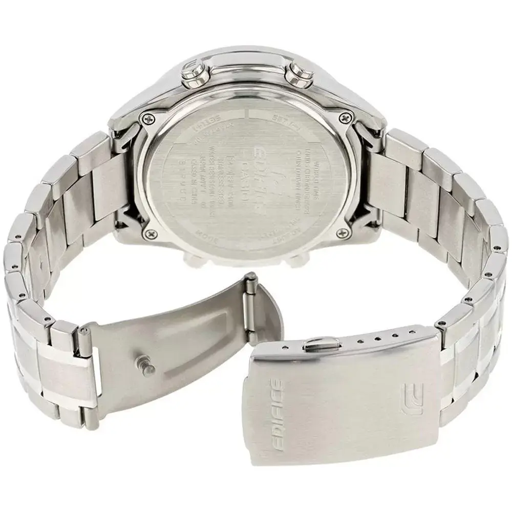 Часы с аналогово-цифровым отображением времени и 10-ти летним аккумулятором станут верным помощником в вашей повседневной жизни. Edifice. Светонакопительное покрытие необрит продолжает светиться в темноте даже после непродолжительного пребывания на свету. Записная книжка на 30 ячеек памяти для записи имен и телефонных номеров, каждая запись может включать в себя текст из 8 букв и 12 цифр. Мировое время – 30 городов (29 часовых поясов), возможность включения/отключения летнего времени. 12-ти и 24-х часовой формат времени. Секундомер с точностью показаний 1/100с и временем измерения 24ч. Сплит-хронограф. Таймер обратного отсчета от 1мин до 24ч. Раскладывающаяся застежка, расстегиваемая одним касанием.