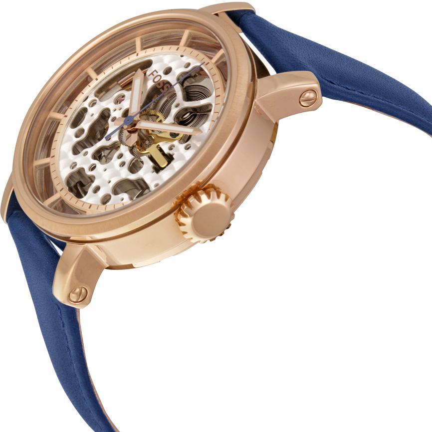 Механические часы с автоподзаводом. Корпус выполнен из нержавеющей стали с IPG покрытием. Синий кожаный ремешок. Скелетон. Центральная секундная стрелка.
