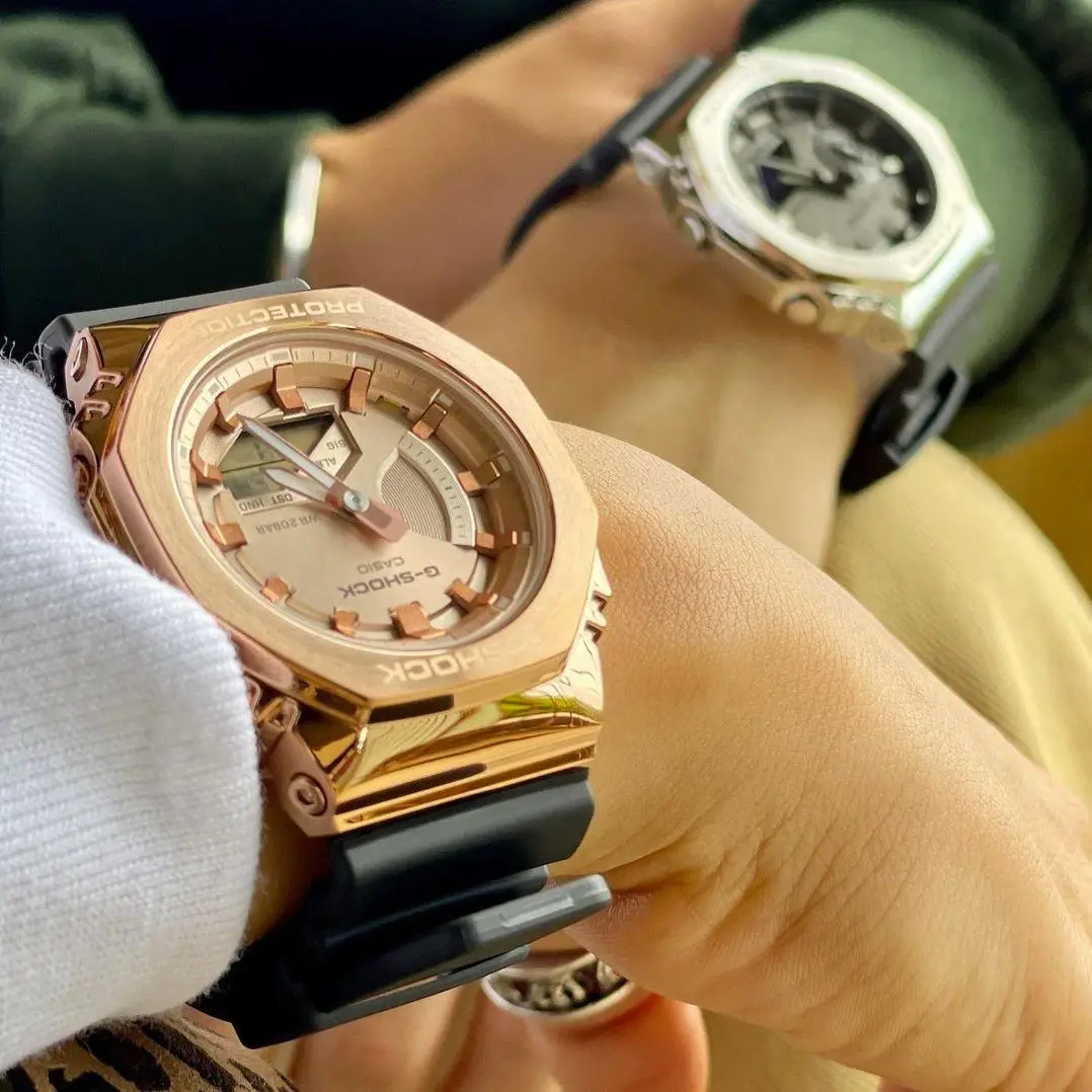 Женские кварцевые часы из серии G-Shock. Комбинированный круглый корпус из стали с покрытием и пластика. Золотистый аналого-цифровой циферблат. Минеральное стекло. WR 200 м. Пластиковый черный ремешок с системой быстрой замены. Простая пряжка.