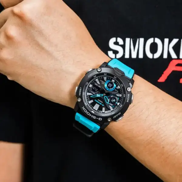 Яркие ударопрочные часы в черно-голубом исполнении для любителей активного образа жизни. G-Shock Carbon Core Guard. Новая серия часов со структурой Carbon Core Guard. Противоударный пластиковый корпус с карбоновыми волокнами более прочный и в то же время более легкий. Этот же материал защищает внутренний модуль от повреждений и деформаций при ударах. Улучшена ударопрочность конструкции кнопок, что устраняет необходимость во внешних защитных накладках. Многокомпонентный циферблат состоит из цифровых окошек указателей числа и дня недели, а также индикатора режима работы часов, который расположен в позиции 9 часов и выполнен в виде пропеллера. Светодиодная подсветка включается большой кнопкой расположенной в нижней части корпуса. Цвет подсветки: белый. Стрелки часов прозрачные и только края окрашены в яркий неоновый цвет, такой же, как и основной ремешок. Мировое время – 48 городов (31 часовой пояс). Функция включения/отключения летнего времени. 12-ти и 24-х часовой формат времени. Секундомер с точностью показаний 1/100с и временем измерения 24ч. Сплит-хронограф. Таймер обратного отсчета от 1/1мин до 24ч с автоповтором. Функция перемещения стрелок. Функция отключения/включения звука. Двойная задняя крышка: стальная закрывает механизм, а поверх неё закреплена пластина из пластика. Благодаря этой накладке у этой модели появилась функция быстрой смены ремешка.