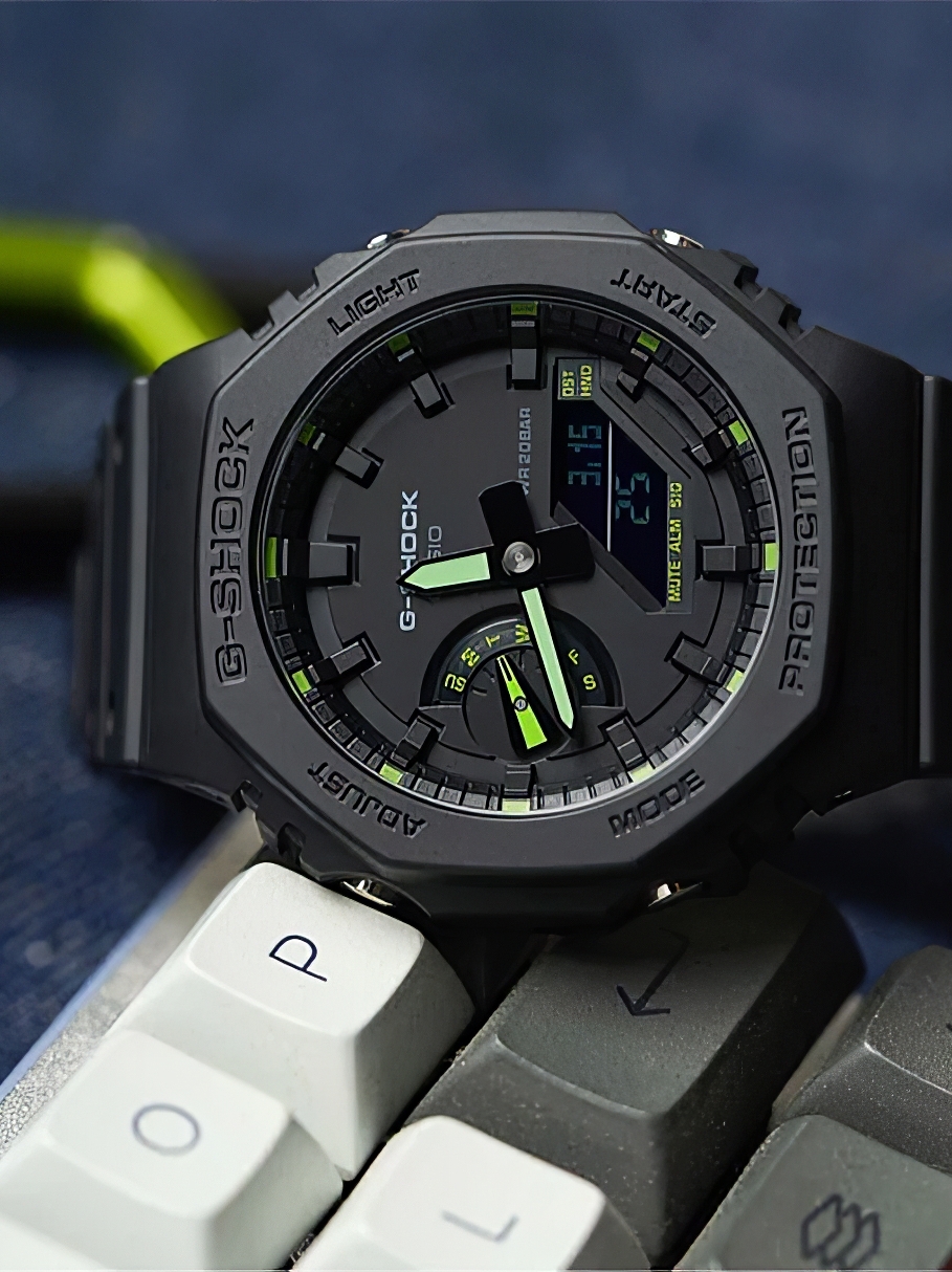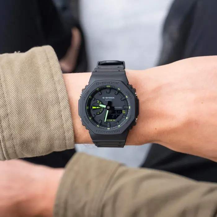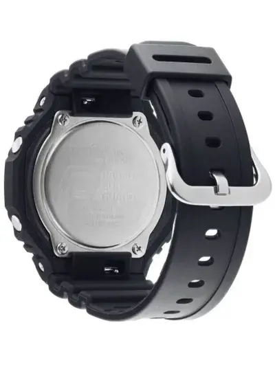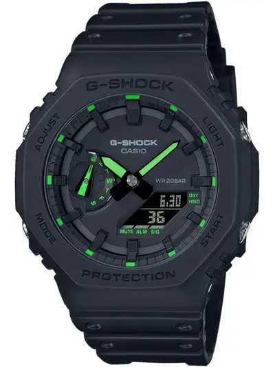 В коллекции G-SHOCK часов, которые продолжают развиваться в поисках предельной прочности, эта цифро-аналоговая модель наследует концепцию моделей первого поколения DW-5000C, став при этом еще тоньше. Наследует восьмиугольную форму, которая также использовалась в модели DW-5000C первого поколения. Благодаря высокопрочному мелкодисперсному полимерному материалу, содержащему углеродное волокно разработана новая модель GA-2100-1A с простым дизайном и толщиной корпуса всего 11,8мм, исключающим все лишнее при сохранении прочной структуры. Угольно-черные часы, созданные для активной и насыщенной жизни. Часы подойдут для использования в водных видах спорта. Новая серия часов со структурой Carbon Core Guard. Противоударный пластиковый корпус с карбоновыми волокнами более прочный и, в то же время, более легкий. Этот же материал защищает внутренний модуль от повреждений и деформаций при ударах. Зеленые метки и стрелки. Двойная подсветка Super illuminator с функцией Afterglow (для подсветки не нужно удерживать кнопку, время послесвечения настраивается 1,5 или 3 сек): одновременно подсвечивается аналоговый циферблат и цифровой дисплей. Светонакопительное покрытие Neobrite обеспечивает длительное послесвечение в темноте даже после кратковременного нахождения на свету. Мировое время. 12-ти и 24-х часовой формат времени. Секундомер с точностью показаний 1/100с и временем измерения 24ч. SPLIT-хронограф. Таймер обратного отсчета от 1с до 24ч. Функция перемещения стрелок. Функция отключения/включения звука. Задняя крышка на 4-х винтах.