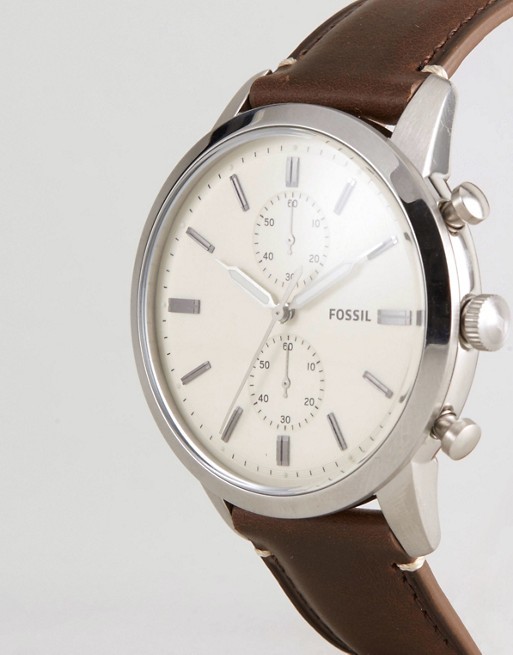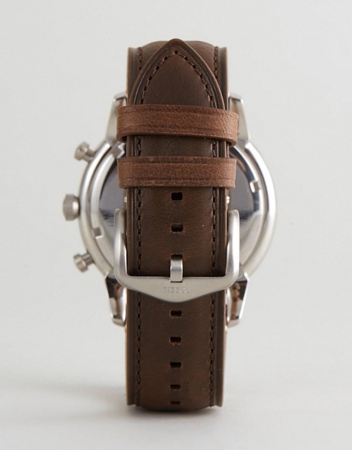 Кварцевые часы. Хронограф. Два малых циферблата на 60 секунд и 60 минут. Корпус выполнен из нержавеющей стали. Люминесцентные стрелки. Кожаный ремешок коричневого цвета шириной 22 мм.