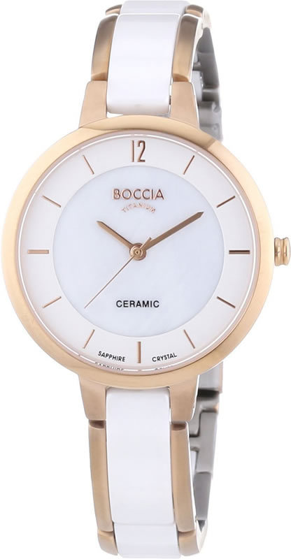 Женские часы из коллекции Boccia Ceramic. Корпус часов и браслет выполнены из белой керамики и беспримесного титана благодаря чему, являются очень легкими, прочными и обладают гипоаллергенными свойствами. PVD-покрытие на браслете и корпусе. Точный кварцевый механизм. Сапфировое стекло. Круглый белый, перламутровый циферблат, диаметр 33 мм, толщина 6 мм. Водонепроницаемость 50м.
