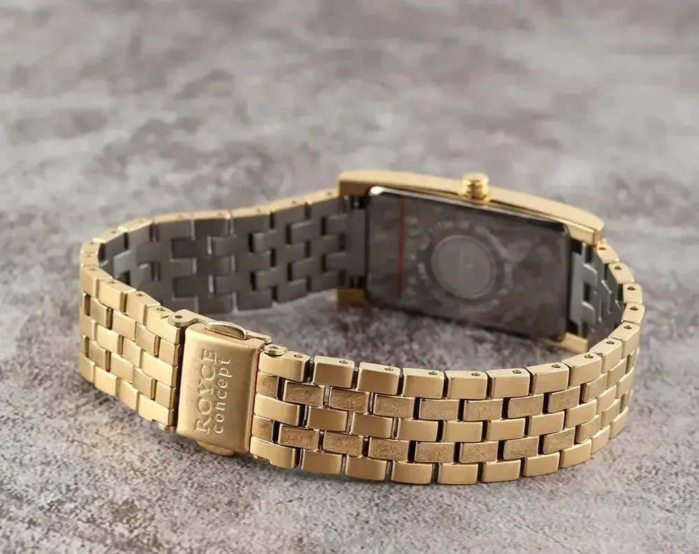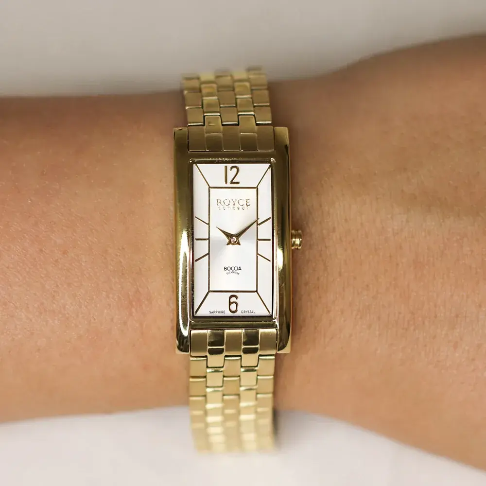 Женские кварцевые часы. Центральные часовая и минутная стрелки. Серебристый циферблат. Прямоугольный корпус выполнен из гипераллергенного титана с PVD покрытием цвета желтого золота. Ширина корпуса составляет 19 мм, толщина 7 мм. Титановый браслет с покрытием, раскладывающаяся застежка. Устойчивое к возникновению царапин сапфировое стекло. Водостойкость WR 30 (брызги). Вес примерно 37 г.