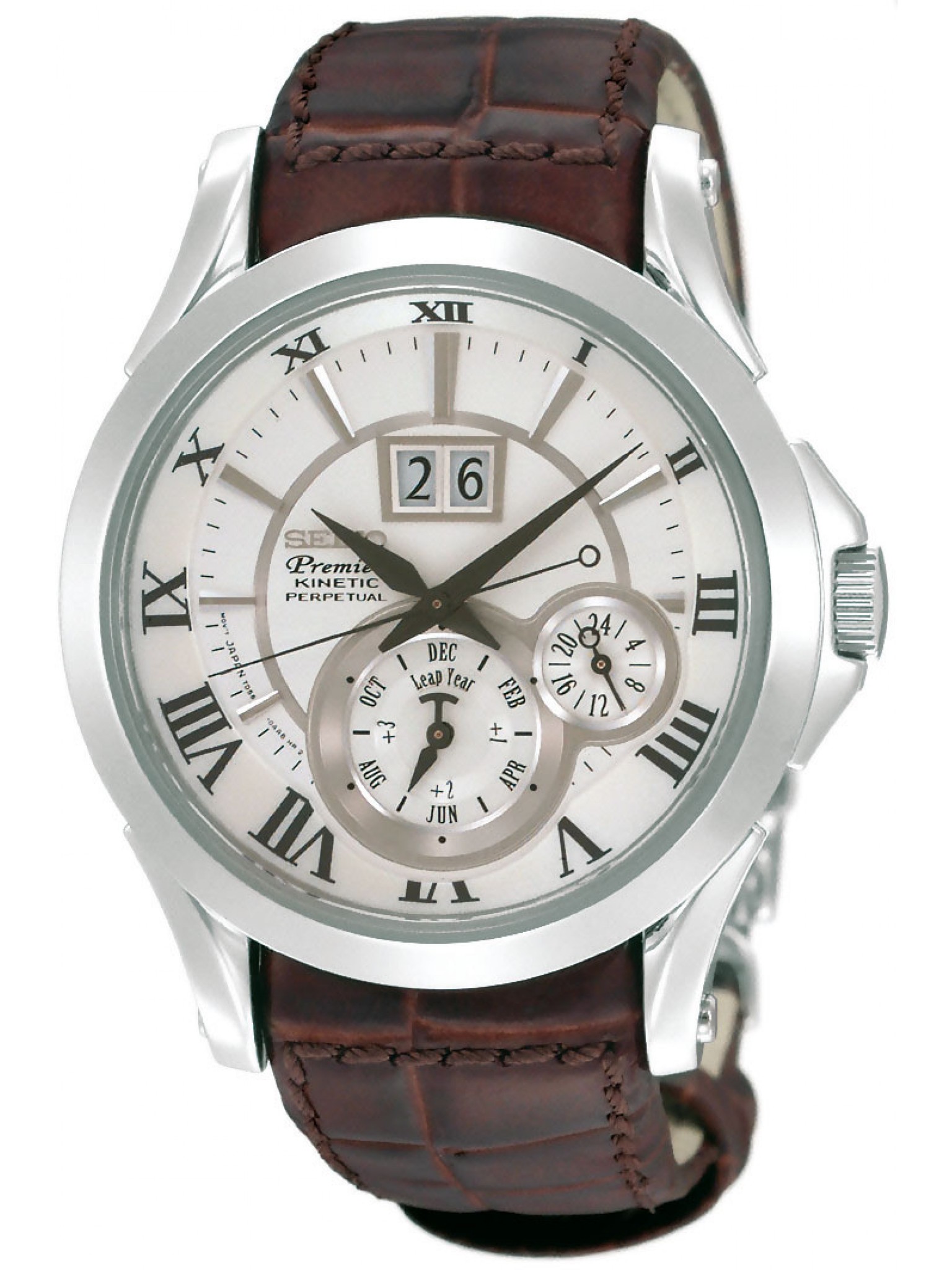 Корпус из нержавеющей стали с коричневым кожаным ремешком. Фиксированный безель из нержавеющей стали. Серебряный циферблат с серебряными метками и римскими цифрами, стрелками. Минуты. Тип- аналоговый. Отображение даты ниже позиции 12 часов. Отображаются два хронографа: месяц и 24 часа. Индикатор високосного года. Кинетическое движение. Устойчивое к царапинам сапфировое стекло. Диаметр корпуса: 43 мм. Толщина корпуса: 12 мм. Водонепроницаемость 100 метров / 330 футов. Функции: часы, минуты, секунды, календарь, GMT, индикатор високосного года. Стиль спортивных часов. Seiko Кинетический вечный календарь - SNP023P1.