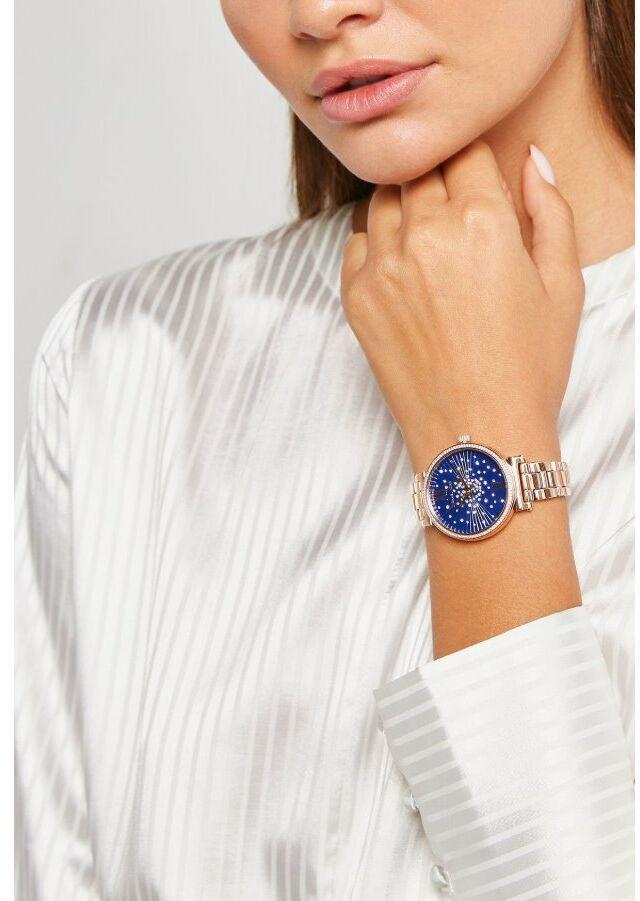Женские кварцевые часы. Корпус выполнен из нержавеющей стали с частичным IP покрытием. Корпус и циферблат украшен кристаллами. Синий циферблат. Минеральное стекло. Центральная секундная стрелка. Диаметр корпуса 36 мм. Стальной браслет шириной 14 мм с IP покрытием