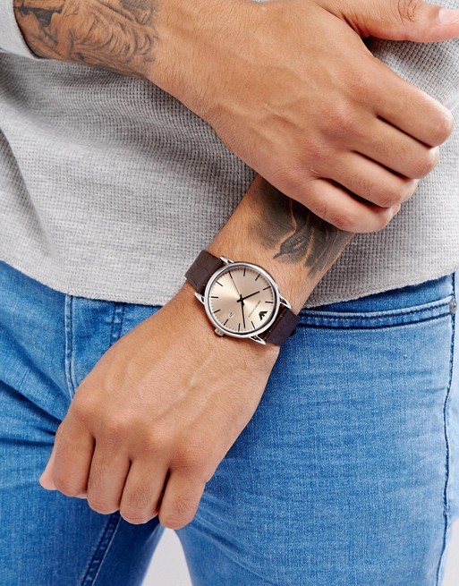 Кварцевые часы. Водостойкость WR 50. Часы, минуты, секунды, дата. Корпус выполнен из нержавеющей стали. Диаметр корпуса 43 мм, толщина 9 мм. Минеральное стекло. Кожаный ремешок.