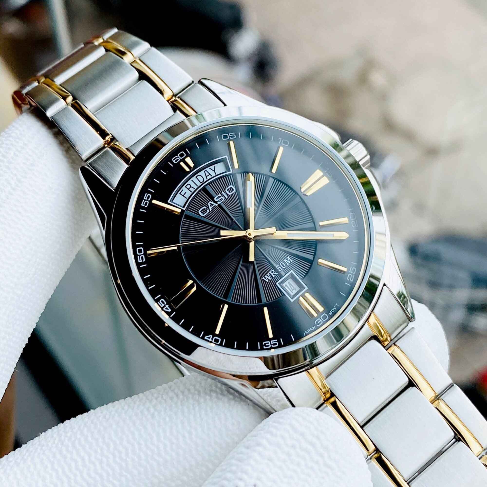 Японские мужские наручные часы с минеральным стеклом Casio MTP-1381G-1A, кварцевый механизм с высокой точностью. Класс водозащиты: 50 метров, позволит защитить корпус от случайных брызг или капель дождя. Корпус часов изготовлен из стали. Стальной браслет на раскладной застёжке с IP-покрытием. Окошко даты находится в положении 6 часов.