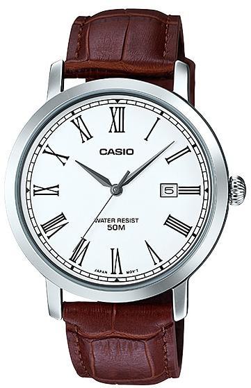 Мужские стильные часы с круглым металлическим корпусом на кожаном ремешке или стальном браслете. Традиционный дизайн. Минеральное стекло выпуклой формы. Циферблат с римскими цифрами. Водозащита 5 АТМ. Точный кварцевый механизм.