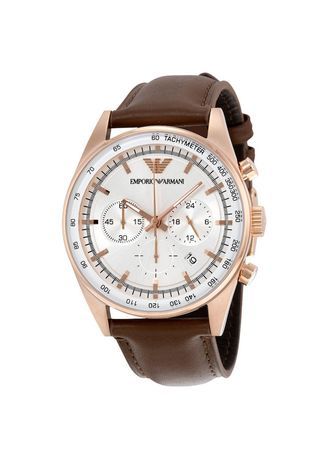Кварцевый хронограф. 12/24 часовой формат времени. Секундомер. Тахиметр. Индикатор числа. Перламутровый циферблат. Люминесцентные стрелки. Минеральное стекло. Корпус из нержавеющей стали с розовым IP покрытием. Кожаный ремень. Диаметр 39 мм.