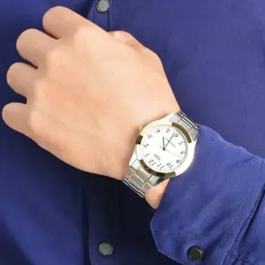 Standard. Мужские часы с круглым корпусом. Циферблат с метками в виде арабских цифр. Рифленая заводная головка. Браслет с раскладывающейся застежкой.