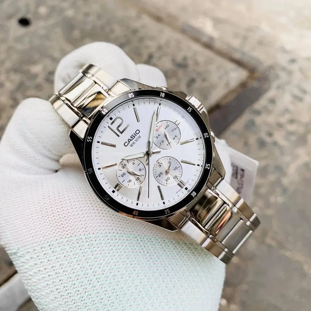 Японские мужские наручные часы с минеральным стеклом Casio Collection MTP-1374D-7A, кварцевый механизм с высокой точностью. Класс водозащиты: 50 метров, позволит защитить корпус от случайных брызг или капель дождя. Корпус часов изготовлен из стали. Стальной браслет на раскладной застёжке. Стрелки с люминесцентным покрытием. 12-ти и 24-х часовой формат времени, число и день недели вынесены на отдельные циферблаты. Метки в виде штрихов и арабской цифры 12. Заводная головка с защитой. Безель с IP-покрытием.