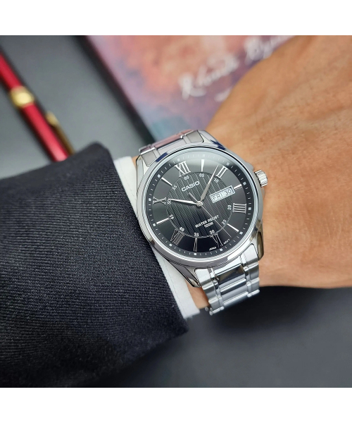 Японские мужские наручные часы с минеральным стеклом Casio Collection MTP кварцевый механизм с высокой точностью. Класс водозащиты: 100 метров, позволит плавать, нырять и заниматься другими водными видами спорта. Корпус часов изготовлен из стали. Стальной браслет на раскладной застёжке. Окошки дня недели и даты находятся в положении 3 часа. Заводная головка с защитой. Задняя крышка с винтовым фиксатором.