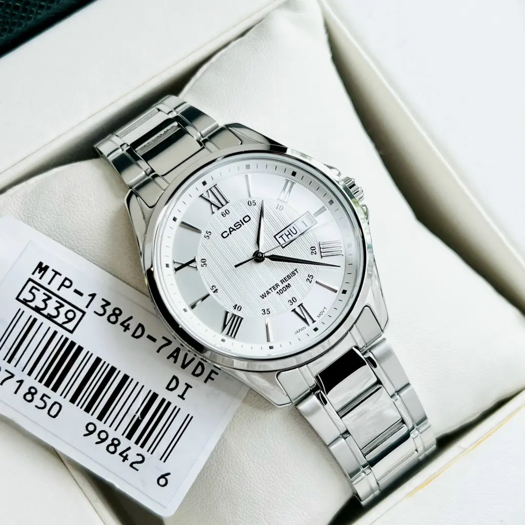 Японские мужские наручные часы с минеральным стеклом Casio Collection MTP-1384D-7A, кварцевый механизм с высокой точностью. Класс водозащиты: 100 метров, позволит плавать, нырять и заниматься другими водными видами спорта. Корпус часов изготовлен из стали. Стальной браслет на раскладной застёжке. Окошки дня недели и даты находятся в положении 3 часа. Заводная головка с защитой. Задняя крышка с винтовым фиксатором.