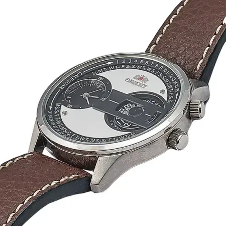 Механические часы с автоподзаводом и ручным заводом + кварцевый механизм. Два независимых циферблата. Калибры: 55741, HM510. В механическом механизме 21 камень, частота 21600 полуколебаний в час. Возможность использования одного из циферблатов для показания текущего времени во втором часовом поясе. Возможность ручного завода. Точность хода не хуже +25/-15 секунд в сутки. Центральная секундная стрелка. Индикация даты и дня недели. Прозрачная задняя крышка. Корпус выполнен из нержавеющей стали с PVD покрытием. Коричневый ремешок из натуральной кожи.
