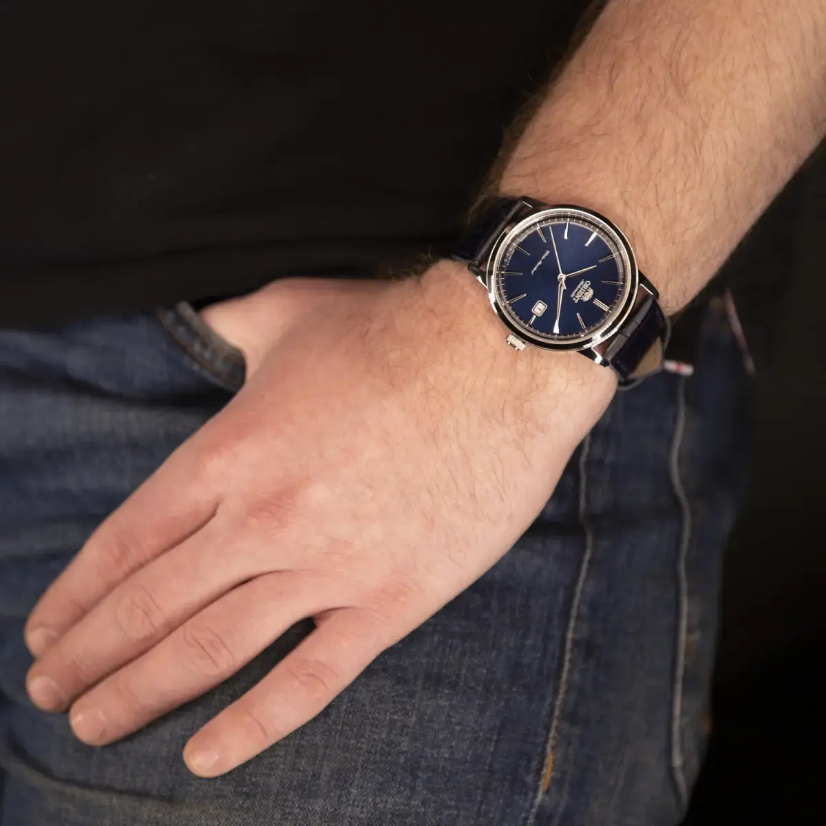 Закаленное минеральное стекло обеспечивает надежную защиту от случайных царапин и повреждений. Внизу синий циферблат ваших новых часов мечты .