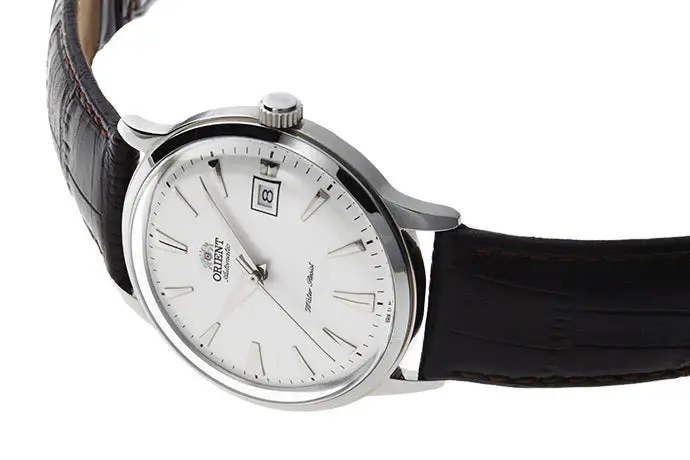 Корпус из нержавеющей стали в паре с коричневым кожаным ремешком. Фиксированный безель из нержавеющей стали и белый циферблат с серебристыми стрелками и индексными часовыми маркерами. Минутные маркеры на внешнем ободе. Аналоговый тип циферблата с указателем даты в положении «3 часа». Оснащен автоматическим механизмом Orient calibre F6724 с запасом хода 40 часов. Устойчивое к царапинам минеральное стекло, круглый корпус диаметром 40,5 мм и толщиной 13 мм. Ширина ремешка составляет 21 мм с застежкой-язычком. Водонепроницаемость до 30 метров / 100 футов. Функции включают дату, часы, минуты и секунды.