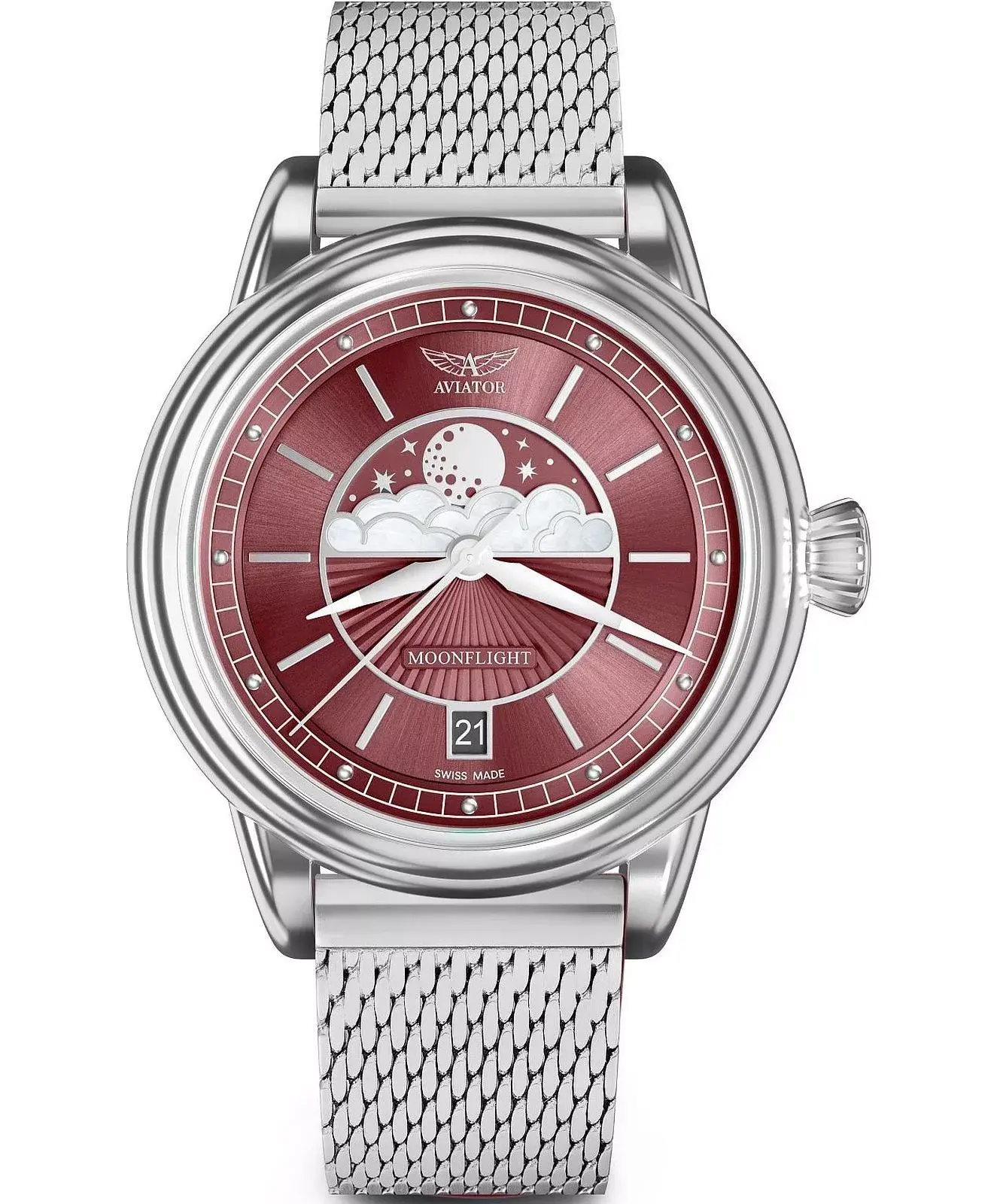 Часы Aviator Douglas Moonflight Limited Edition V.1.33.0.264.5, выпущенные ограниченной серией в 950 экземпляров, предназначены для женщин, которые ценят эксклюзивные, искусно выполненные аксессуары. Модель оснащена кварцевым механизмом Ronda 708 Swiss Made, имеет указатель дня месяца, стрелки с покрытием Super-LumiNova и индикатор фаз Луны с перламутровыми облаками. Для корпуса и сетчатого браслета использована нержавеющая сталь серебристого цвета. Красный полированный циферблат защищен от повреждений сапфировым стеклом с антибликовым покрытием. Крышка изделия украшена гравировкой самолета Douglas DC-3. Водонепроницаемость часов составляет 100 метров.