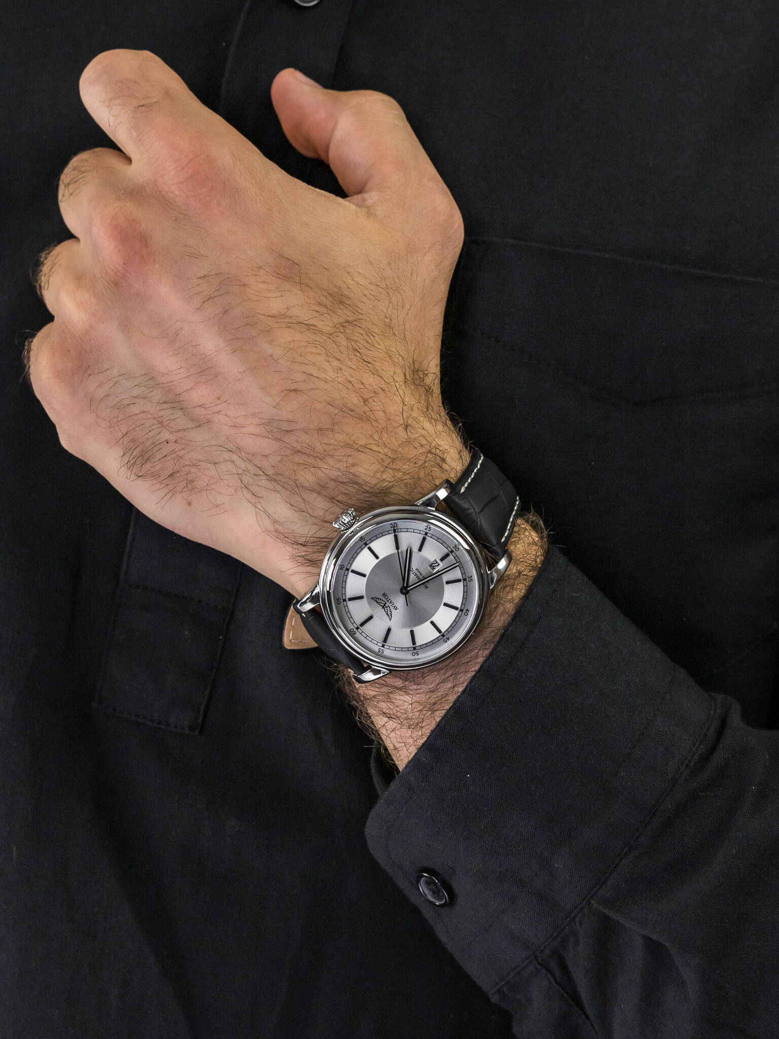 Часы Aviator были разработаны с учетом рекомендаций и опыта настоящих пилотов. Инструктируя о функциональности и удобочитаемости, герои, летающие в небесах, дали бренду вдохновение для создания только самых лучших часов. Douglas DC-3. Лимитированная серия. Коллекция Douglas была разработана в честь известного американского пассажирского самолета Douglas DC-3. В механизме 26 камней, частота 28800 полуколебаний в час. Калибр управляется регулятором Etachron, который обеспечивает высокую точность хода как на земле, так и над землей. Запас хода 38 часов. Противоударное устройство оси баланса Incabloc. Циферблат выполнен по технологии sunray (солнечные лучи). Часовые метки выполнены в виде штрихов. Прозрачная задняя крышка украшена имитацией функции контроля управления хвоста самолета. Ротор механизма указывает на градусы, как в авиационном приборе триммер. Полированный стальной корпус. Кожаный ремешок с тиснением под крокодила. Раскладывающаяся застежка.