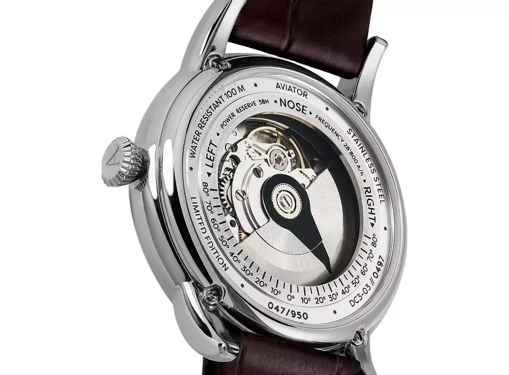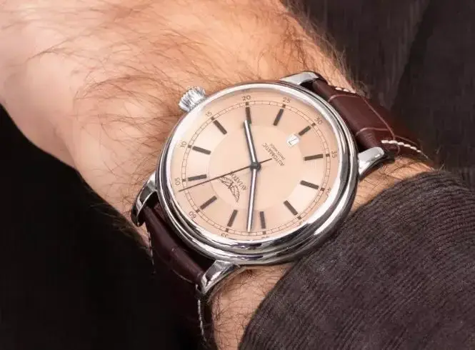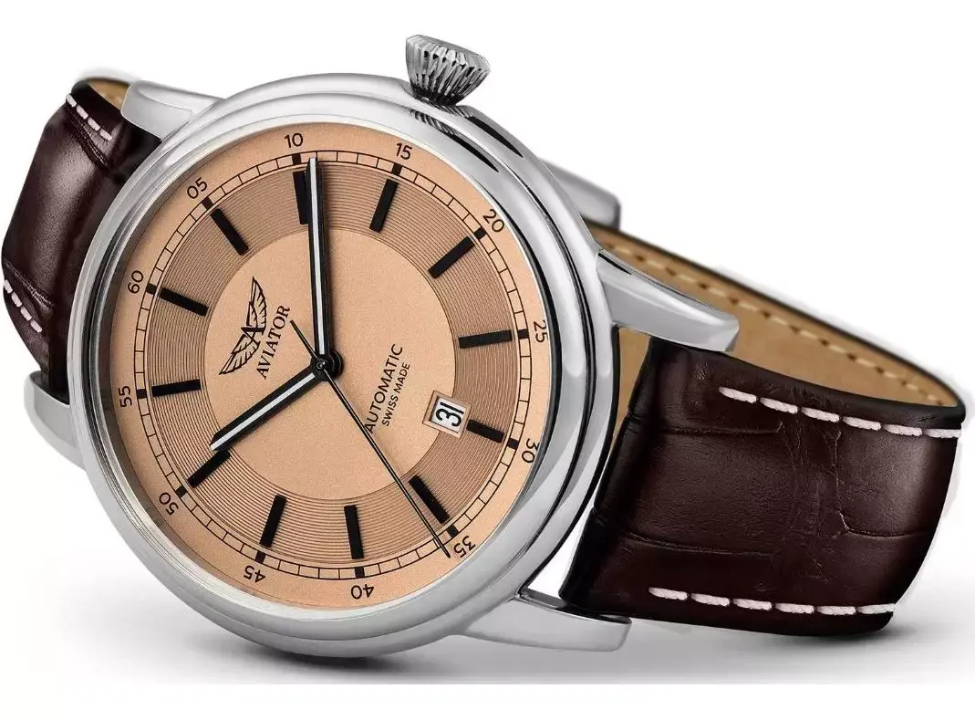 Эта великолепная модель мужских классических часов из лимитированной серии Aviator V.3.32.0.244.4 Douglas DC-3, посвященной известному американскому пассажирскому самолету Douglas DC-3, оснащена надежным и высокоточным механизмом с автоподзаводом. В механизме 26 камней, частота 28800 полуколебаний в час. Регулятор калибра Etachron. Запас хода 38 часов. Противоударное устройство оси баланса Incabloc. Корпус часов выполнен из стали с прозрачной задней крышкой. Цвет-серебристый. Безель средний, ушки классические, заводная коронка рифленая, в виде чаши. Бежевый циферблат находится под надежной защитой сапфирового стекла с антибликовым эффектом. Ширина корпуса 45мм. Водостойкость 100м. Ремешок красно-коричневый, с прошвой и прочной раскладной застежкой. Тип индексации- темные индексы и люминесцентные стрелки. Есть окно даты