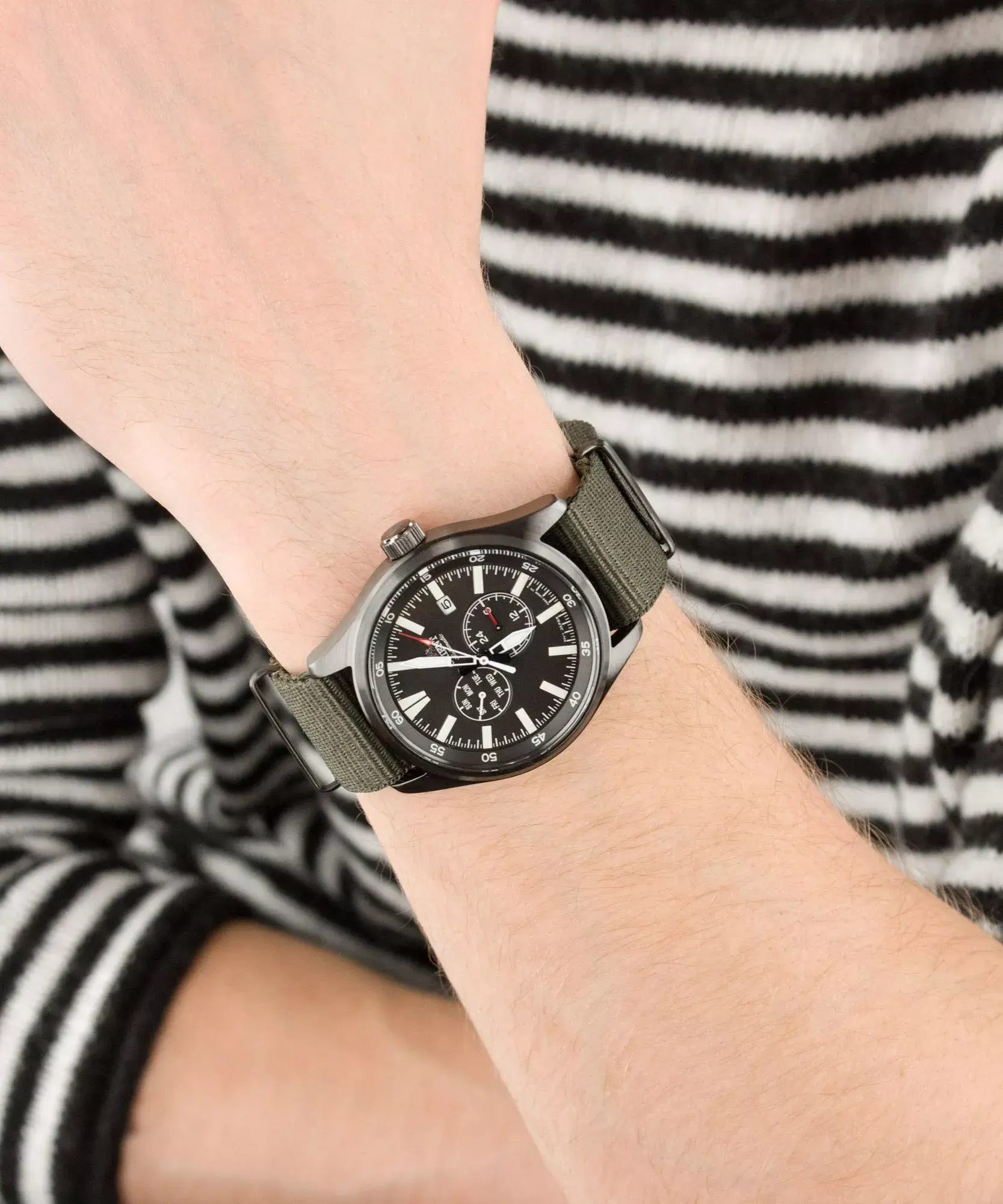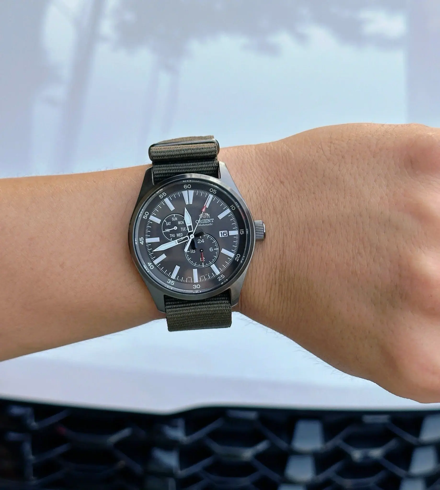 Orient Sports Field Defender RA-AK0402E10B — мужские часы со спортивным характером. Черный корпус из нержавеющей стали подвешен на зеленом тканевом ремешке в стиле НАТО. Серый циферблат оснащен расширенным циферблатом даты и дня недели. Люминесцентное покрытие позволяет считывать текущие данные при любом освещении. Модель оснащена прозрачной задней крышкой и функцией остановки секунд. Все покрыто ударопрочным минеральным стеклом. Точная работа обеспечивается автоматическим механизмом Orient F6B22, который приводится в действие движениями запястья. Механизм оснащен 40-часовым запасом хода и возможностью ручного завода.