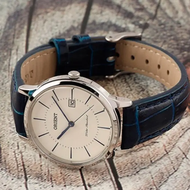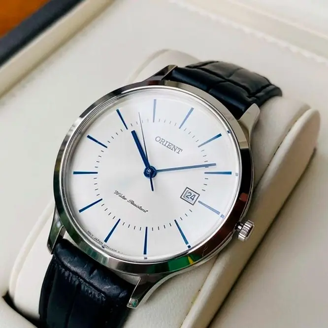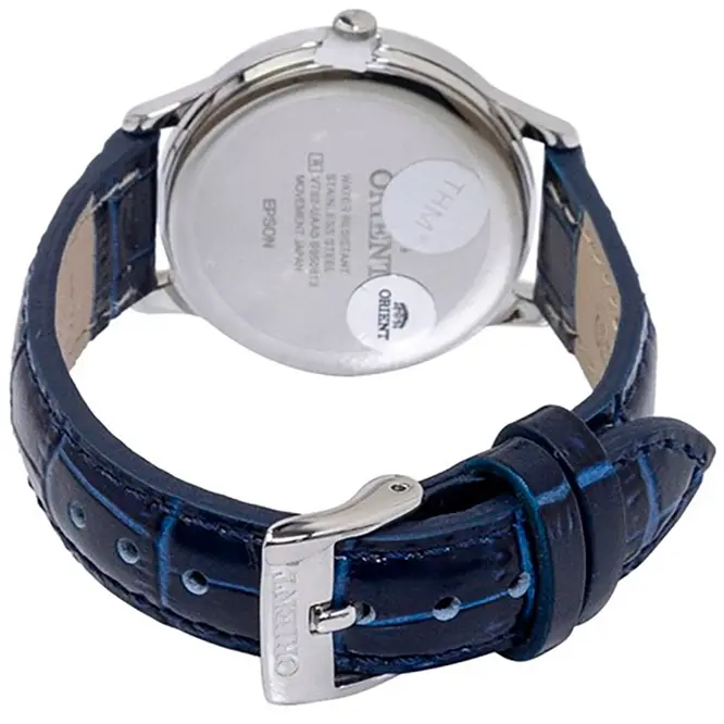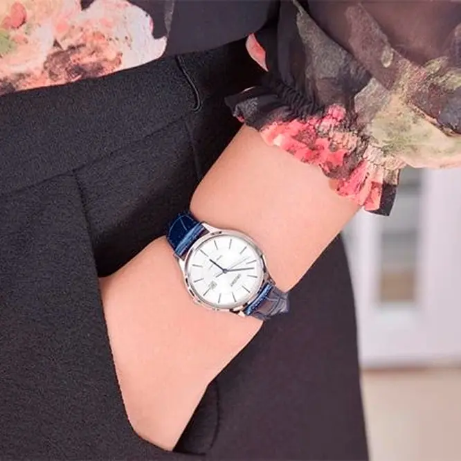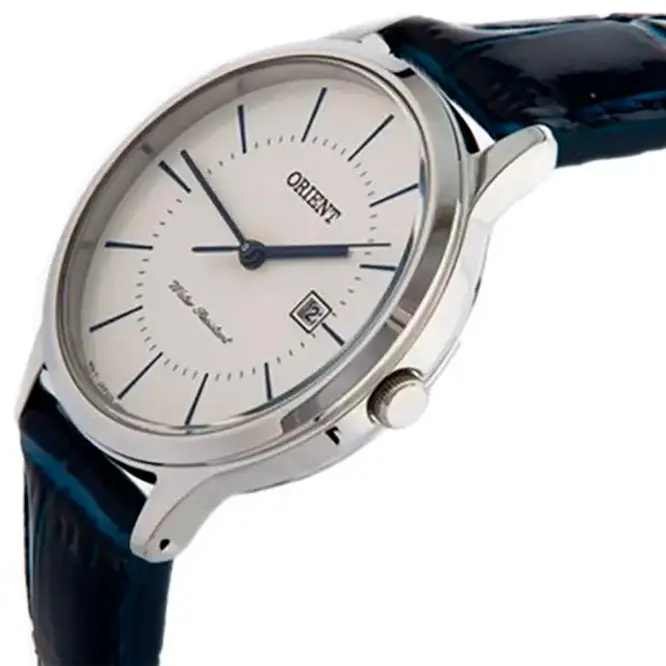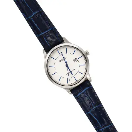 Кварцевые часы. Водостойкость WR 30. Центральные часовая, минутная и секундная стрелки. Индикация даты. Серебристый циферблат с часовыми индексами в виде штрихов. Корпус выполнен из нержавеющей стали. Диаметр корпуса 30 мм. Устойчивое к возникновению царапин минеральное стекло. Кожаный ремешок синего цвета. Стальная застежка.