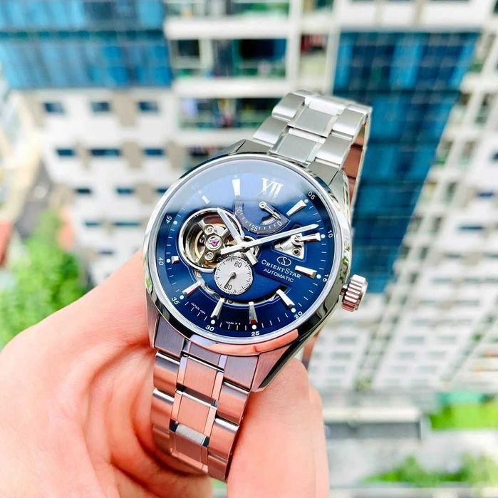 Внешний вид часов ORIENT RE-AV0003L00B богат деталями. На синей основе циферблата по внешнему периметру расположились накладные стальные метки, в положении 12 часов индикатор запаса хода, в положении 9 часов открытое окно, через которое вы можете наблюдать работу баланса, он делает 21 600 полуколебаний в час. Крупные стальные стрелки имеют светонакопитель, как и маленькие точки возле основных часовых метках. Круглый корпус часов выполнен из нержавеющей стали диаметром 41 мм и толщиной 12.2 мм, задняя крышка корпуса прозрачная, сверху установлено сапфировое стекло. Дополнен корпус стальным браслетом с раскладывающейся застежкой. Водозащита позволит часам контактировать с водой. Orient Star премиальная коллекция в которой сочетается совершенное мастерство часового искусства.