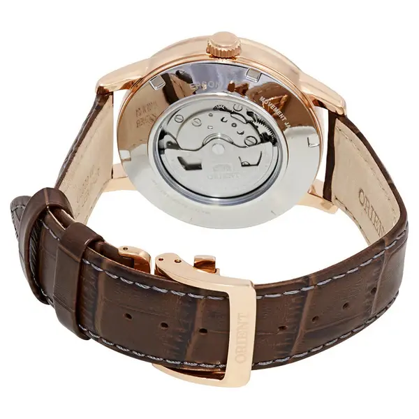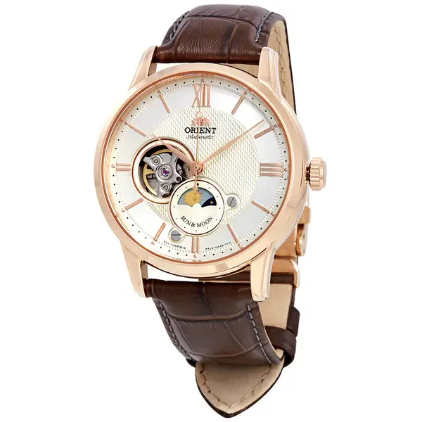 Мужские часы Orient RA-AS0003S10B Automatic Classic Sun & Moon оснащены японским автоматическим механизмом F6L24 с возможностью ручного завода, имеет запас хода до 40 часов. Классический циферблат защищен устойчивым сапфировым стеклом. На циферблате «открытое сердце», которое позволяет видеть часть механизма, задняя крышка прозрачная, благодаря ей у вас есть полный обзор работы механизма, она завинчивающаяся. Интересной функцией является индикатор в виде небольшого диска в положении "6 часов", который сообщает нам о приходе ночи или рассвета. Механизм помещен в стальной корпус, который полностью покрыт методом PVD, создав прочное покрытие из розового золота, что делает модель RA-AS0003S10B идеальным подарком на долгие годы. На запястье крепятся при помощи кожаного коричневого ремня с тиснением и строкой в тон, застежка-бабочка. В этой модели соединились часовое мастерство и непревзойденный внешний вид. ORIENT RA-AS0003S10B - часы, которые приятно будет получить в коллекцию любому ценителю японских аксессуаров.