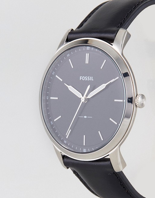 Fossil The Minimalist. Кварцевые часы. Корпус выполнен из нержавеющей стали. Черный циферблат. Центральная секундная стрелка. Черный кожаный ремешок шириной 22 мм.