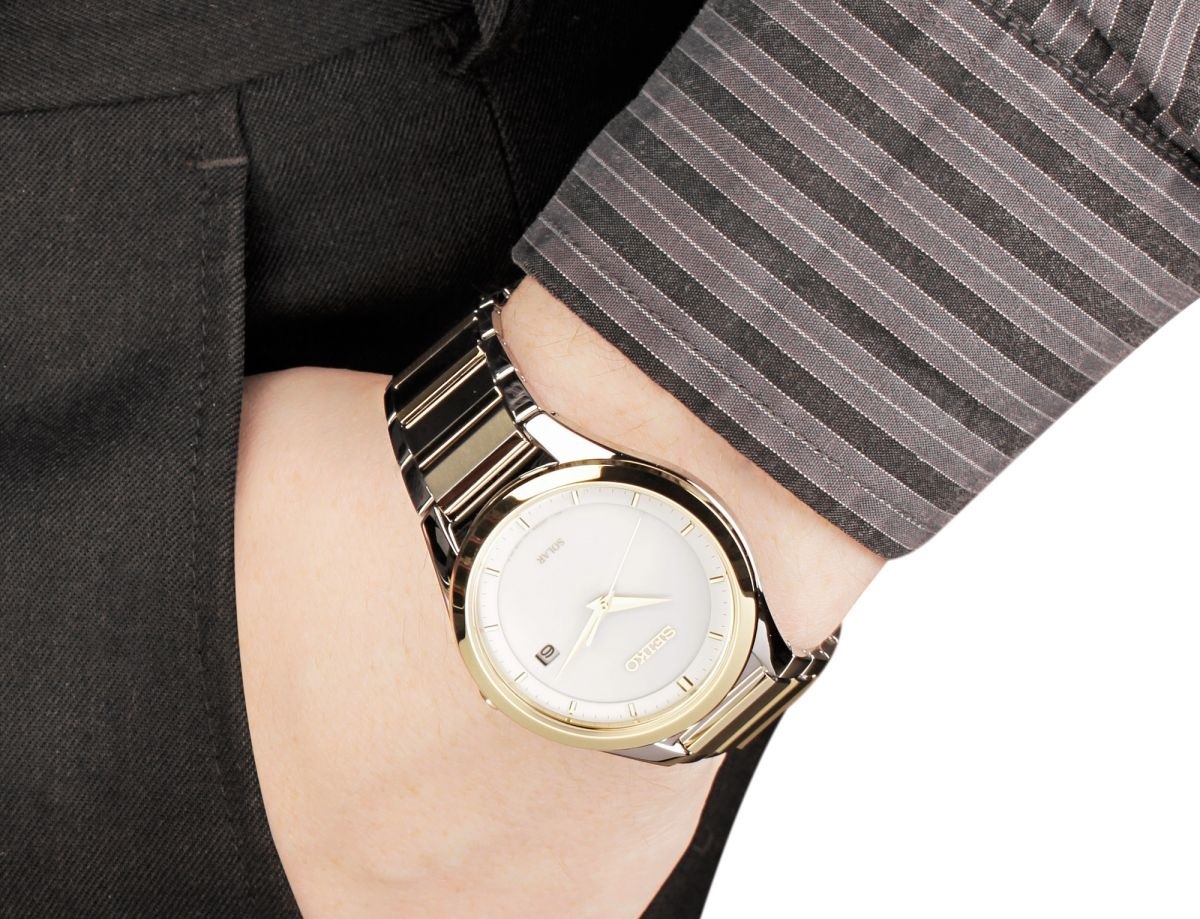 Seiko SNE246P1 - мужские солнечные часы. Корпус этих часов среднего размера (39 мм.) и выполнен из нержавеющей стали. Модель SNE246P1 имеет стекло хардлекс, стальной браслет, белый циферблат. Водоустойчивость: 50 метров. Дополнительные функции и особенности: дата, питание от солнца. Полная заводская комплектация Seiko, гарантия 1 год.