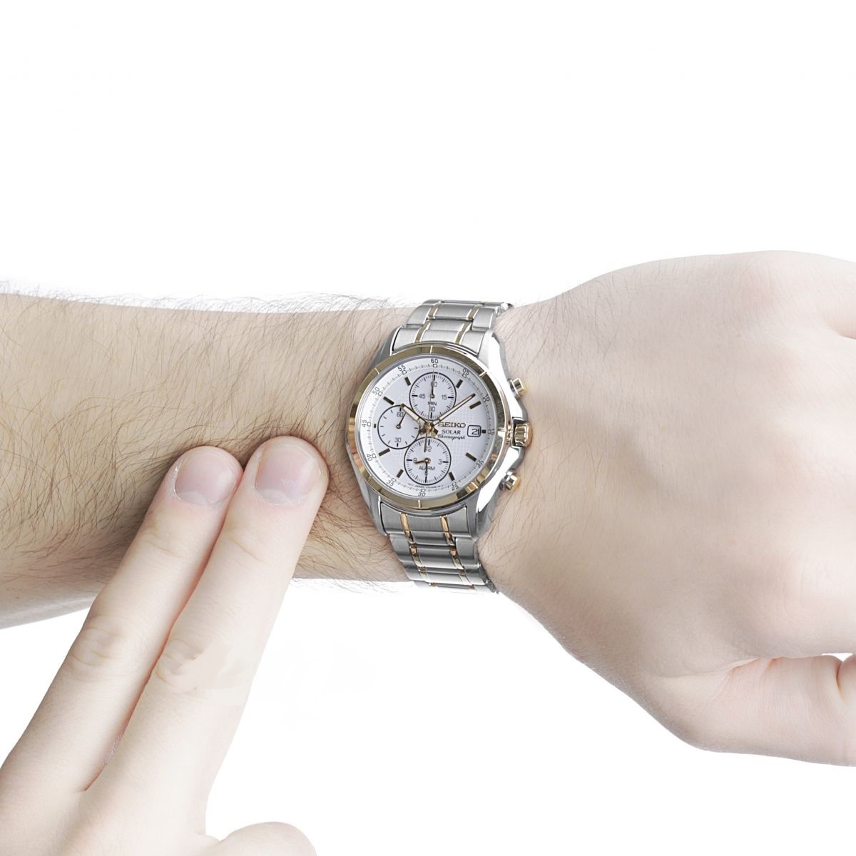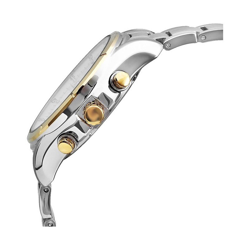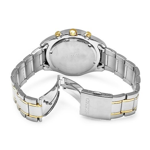 Интересная мужская модель Seiko Solar (солнечная батарея) в шикарном двухцветном дизайне. Циферблат с несколькими хронографами с золотыми метками часов, функцией даты и будильником. Люминесцентные стрелки